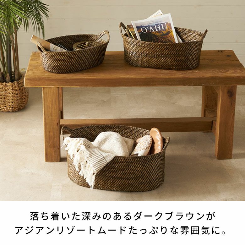 インドネシアの高品質な天然ラタンを使用し、バリ島の熟練した職人がハンドメイドで一つひとつ丁寧に仕上げたバスケット ラタンで編まれたハンドル付きの浅型オーバル収納バスケット(SMLサイズセット)[set-14178-14180]