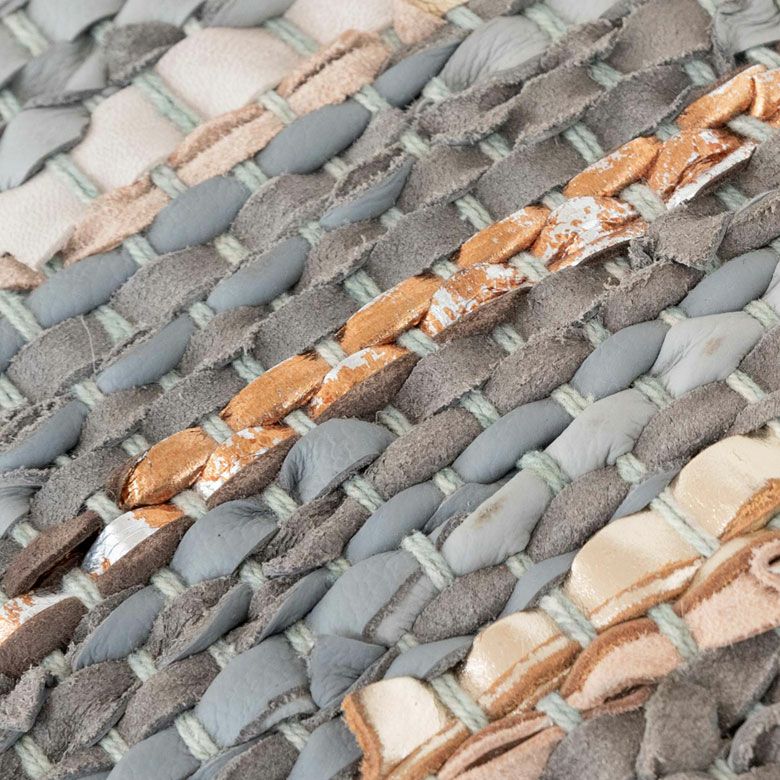 グレーやゴールド系など様々なカラーのレザーをランダムに編み込んだデザイン。