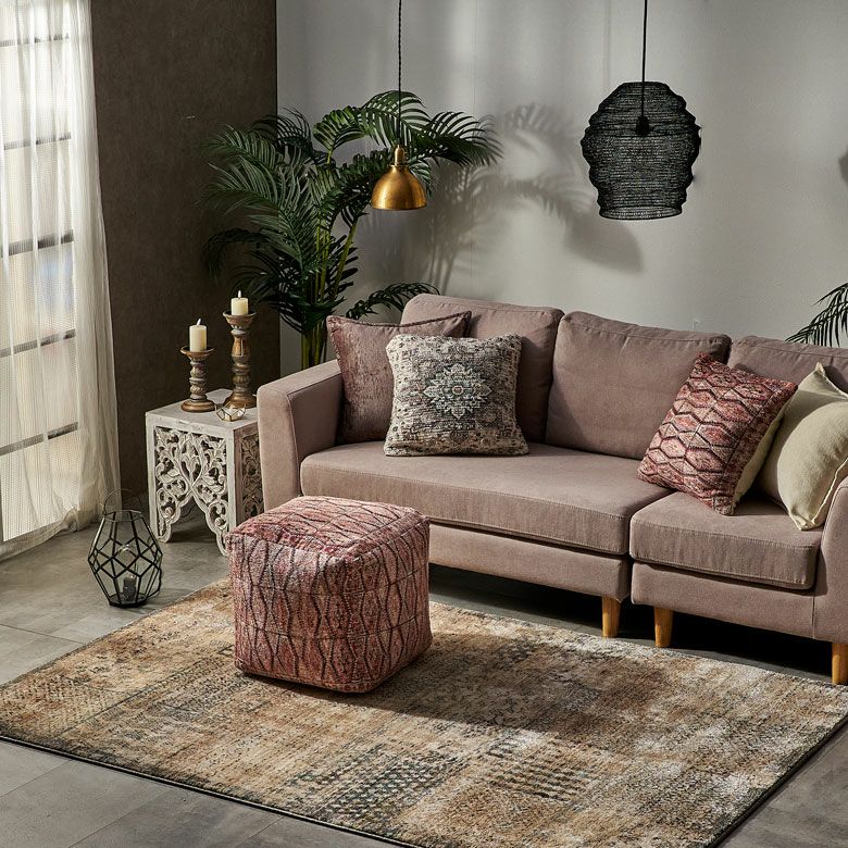 落ち着いたトーンの色合いがおしゃれな、ブリックカラーのキリムデザイン。
