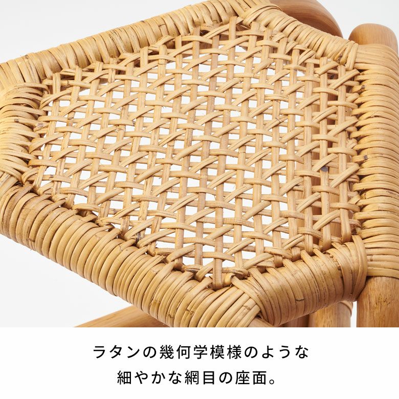 ラタンの幾何学模様のような、細やかな網目の座面。