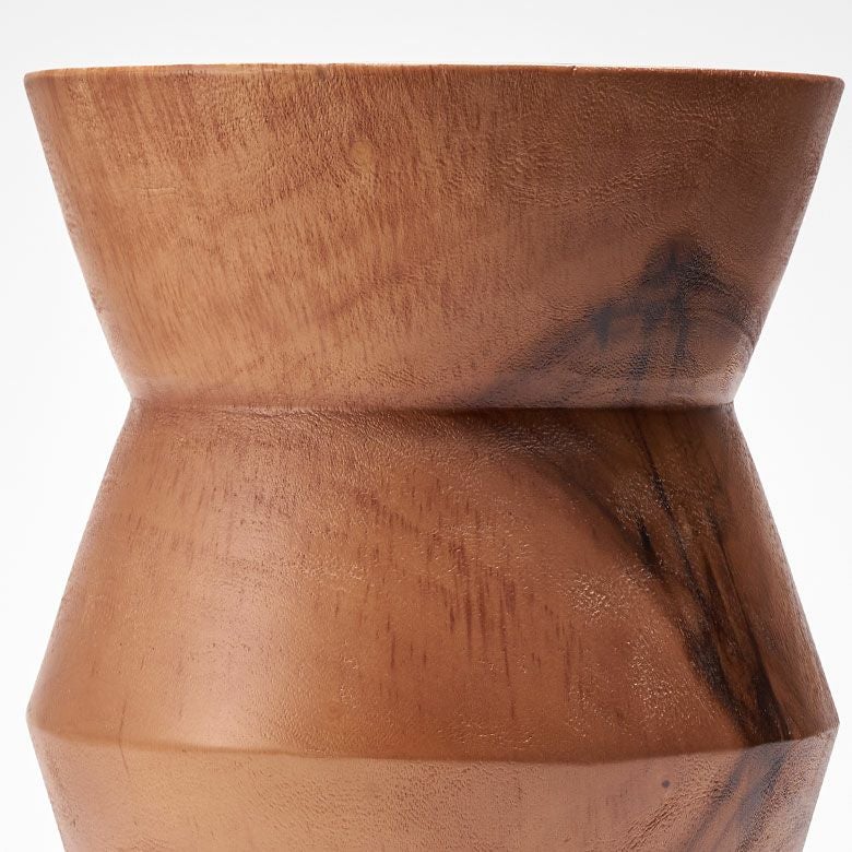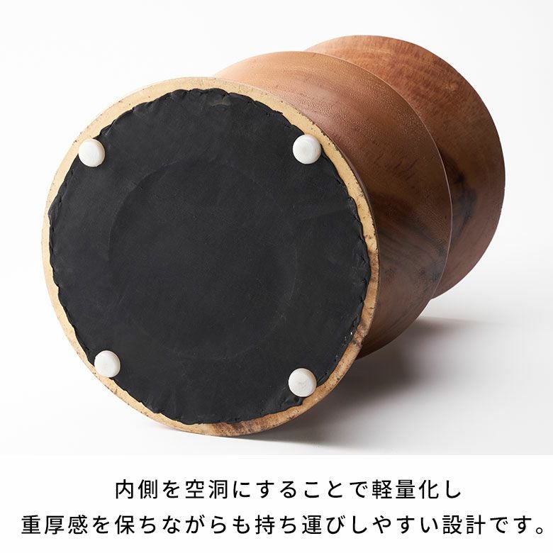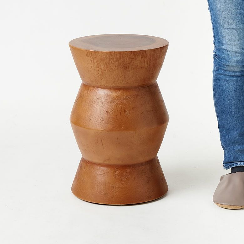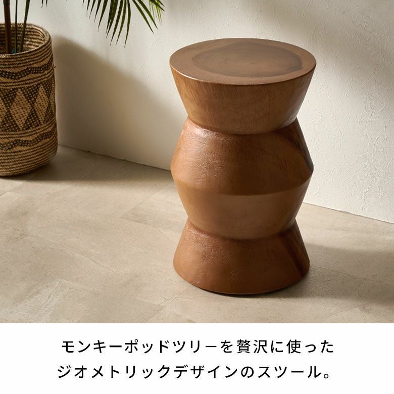 モンキーポッドツリー(スワールウッド)を贅沢に使った、オブジェのようなジオメトリックデザインのウッドスツール。南米ウォルナットとも呼ばれるモンキーポッドは、濃茶色の美しい木目と温かみを感じるナチュラルな質感が特徴です。インドネシアの職人の手作業で作り上げたスツールは、無垢材ならではの滑らかな仕上がりと、唯一無二の存在感を持ちます。内側を空洞にすることで軽量化しつつも、重厚感をしっかりと感じられる構造です。