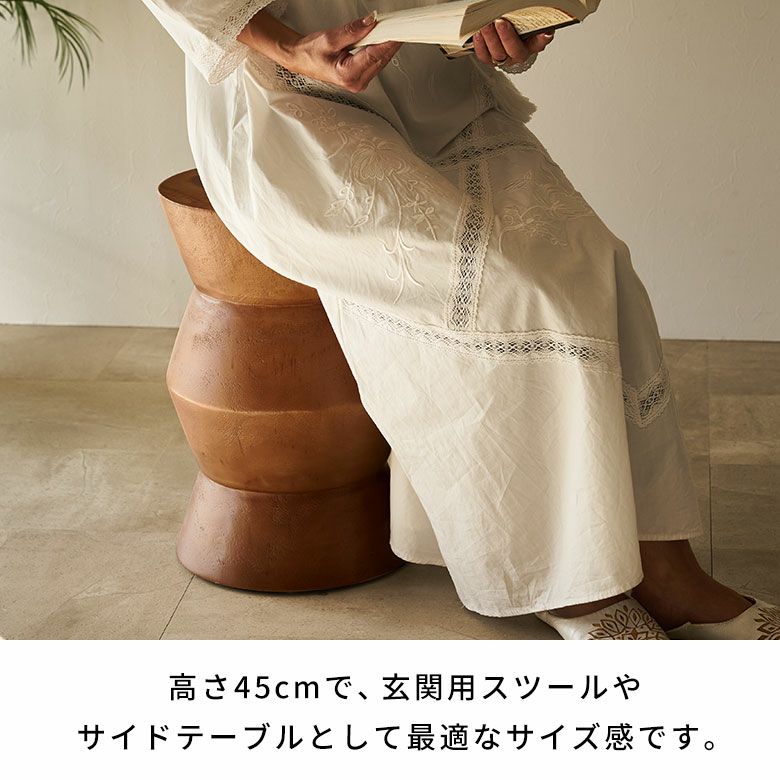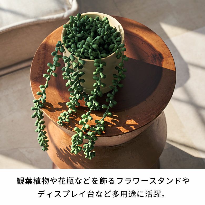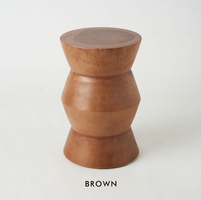 カラーは2色展開。ブラウンは素材本来の風合いを活かしたアンティーク調、ブラックはスタイリッシュでありながら天然素材の温もりを感じさせる仕上げです。スツールとしてはもちろん、サイドテーブルやフラワースタンド、アートピースなど、さまざまなシーンで活用できます。オブジェのようなフォルムは、置くだけで洗練されたアジアンリゾートの雰囲気を演出します。