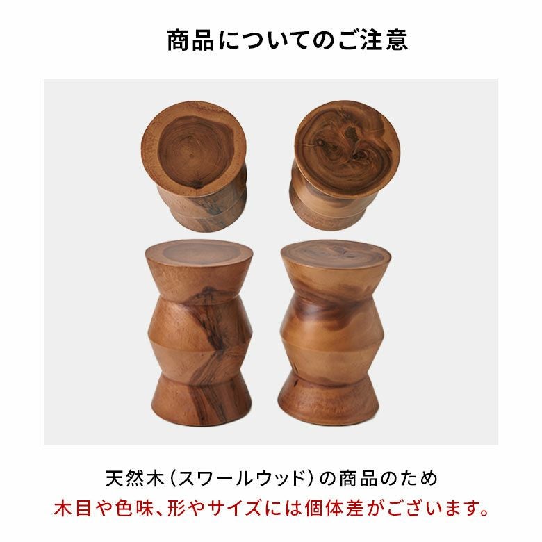 スワールウッドは、中南米を原産とし、ポルトガル人によりインドネシアに移植されたモンキーポッドの現地名です。「南米ウォルナット」とも呼ばれる濃茶色の美しい木目と温かみを感じるナチュラルな質感が特徴で、家具や民芸品に幅広く活用されています。ダイナミックな木目のコントラストが、空間に自然な温かみと個性を与えます。長い年月をかけて育った大木から切り出し、木本来の持つ美しさをそのまま活かしたスツールは、唯一無二の存在感を放ちます。一生使える家具として、暮らしに素敵な彩りを添えてくれます。