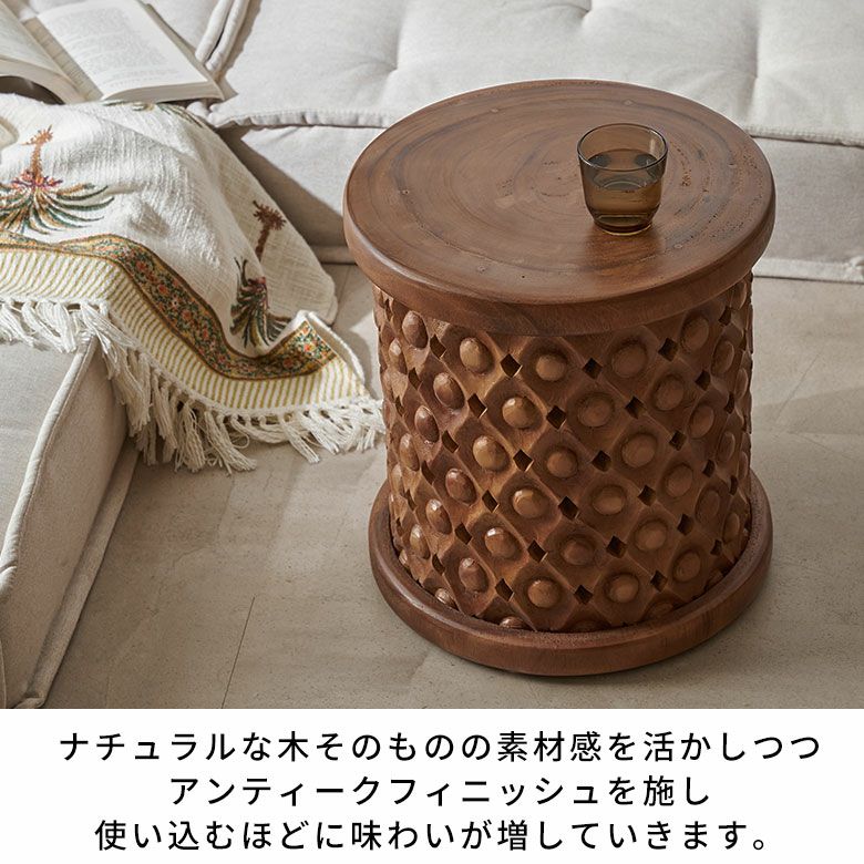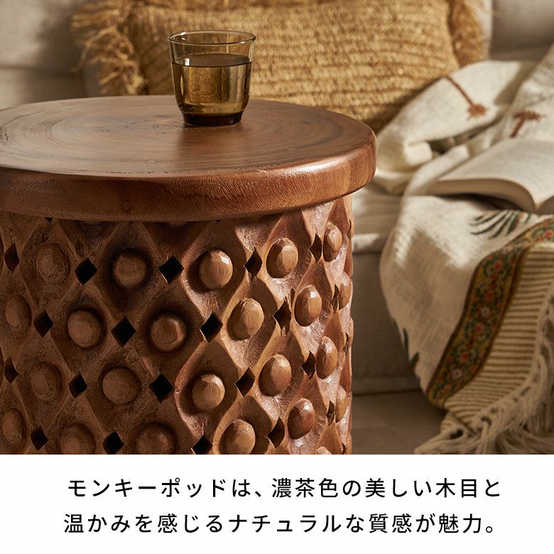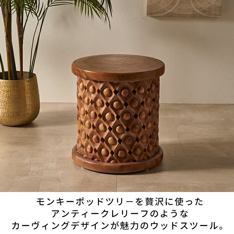 南米ウォルナットとも呼ばれるモンキーポッド(スワールウッド)を贅沢に使用した、アンティークレリーフのようなカーヴィングデザインが魅力のウッドスツール。深みのある木目と温かみのある質感が特徴で、高級感と重厚感を備えています。
