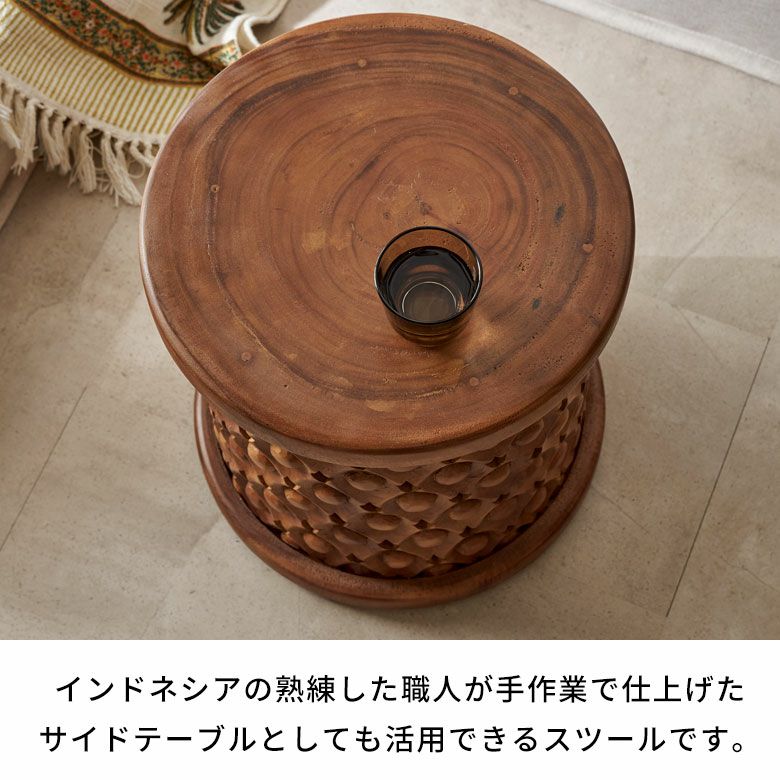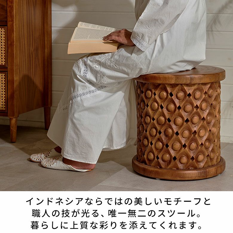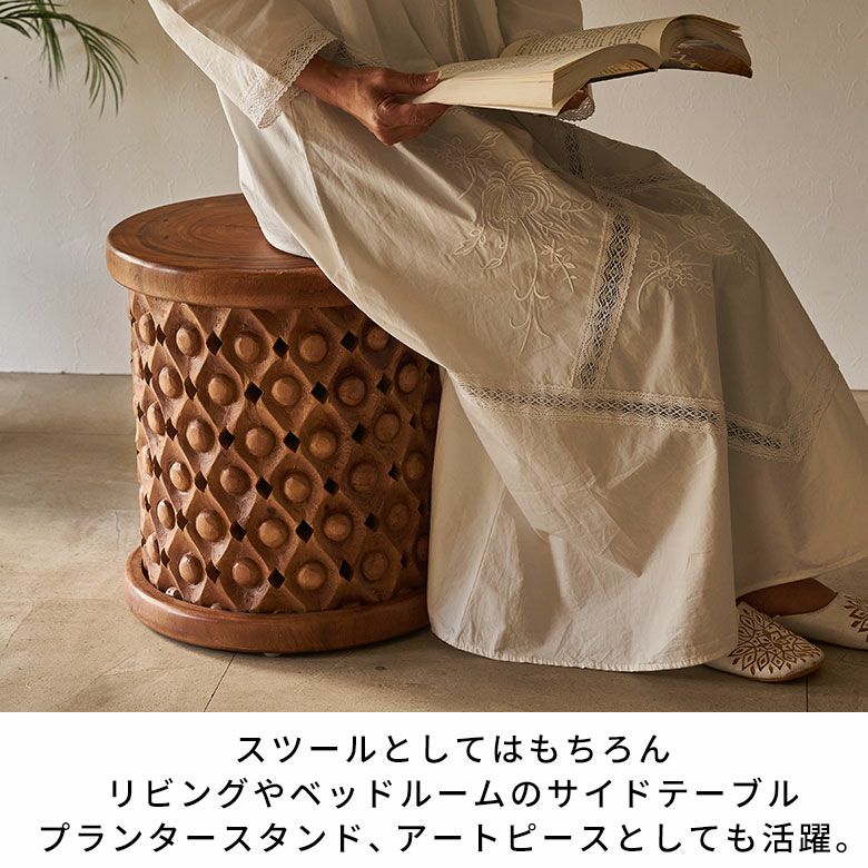 スツールとしてはもちろん、リビングやベッドサイドのサイドテーブル、プランタースタンド、アートピースとしても活躍。ホテルやカフェのインテリアにも最適です。アジアン、リゾート、ボタニカル、和モダンなど、さまざまなスタイルに調和し、自然の温もりを添える逸品。インドネシアならではの美しいモチーフと職人技が光る、唯一無二のスツールをお楽しみください。