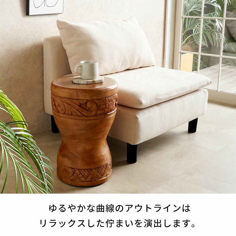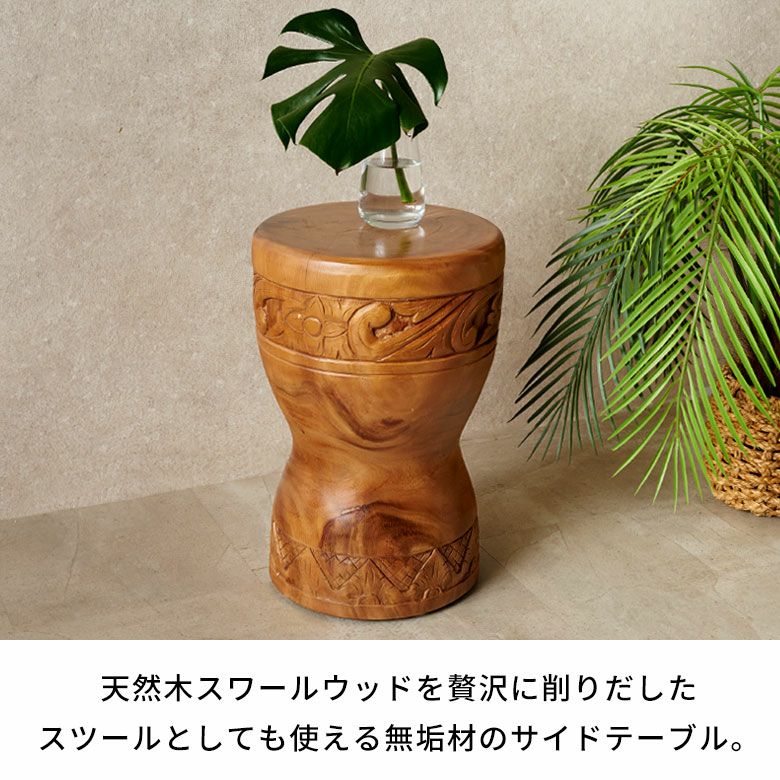 スワールウッド無垢材の木目が美しく、緩やかな曲線のアウトラインがリラックスした佇まいを演出するアジアンリゾート風のサイドテーブル。
