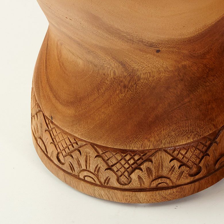 職人の手作業による独特な彫刻模様は、家具でありながらアートピースのよう。天然木ならではの木目模様と調和し、ひとつとして同じものがない味わい深い一台です。