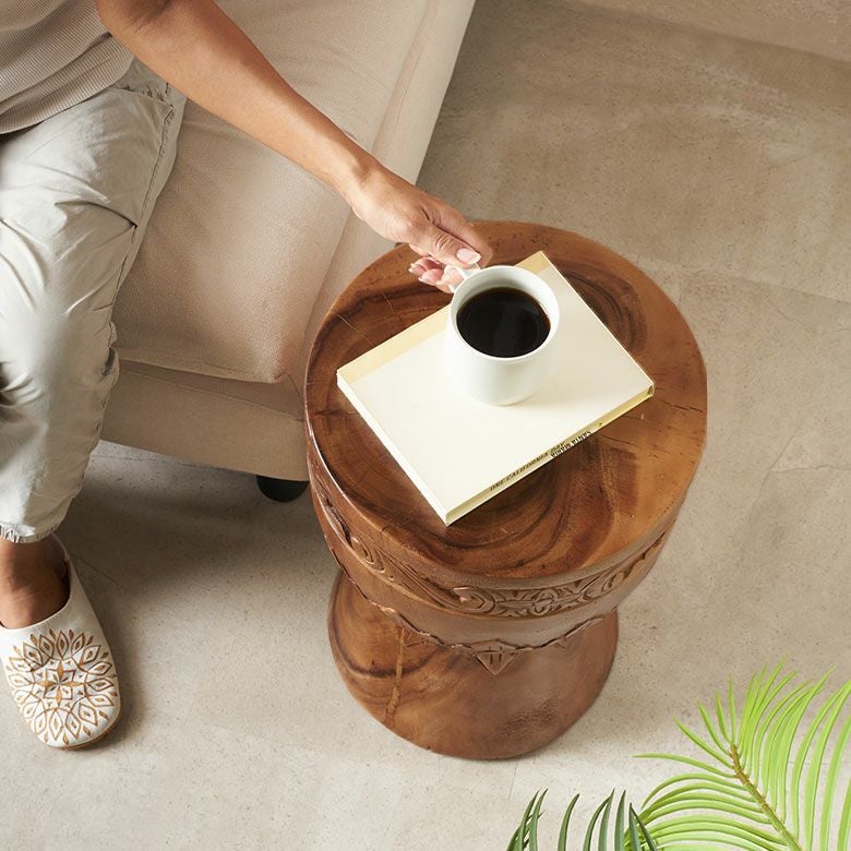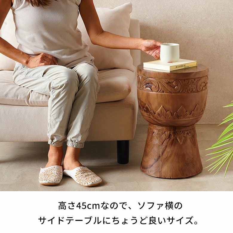 重量約12kgで安定感があり、サイドテーブルとしてはもちろん、ちょっと腰掛けたいときのスツールとして、多彩なシーンで空間に温もりと個性を添えます。