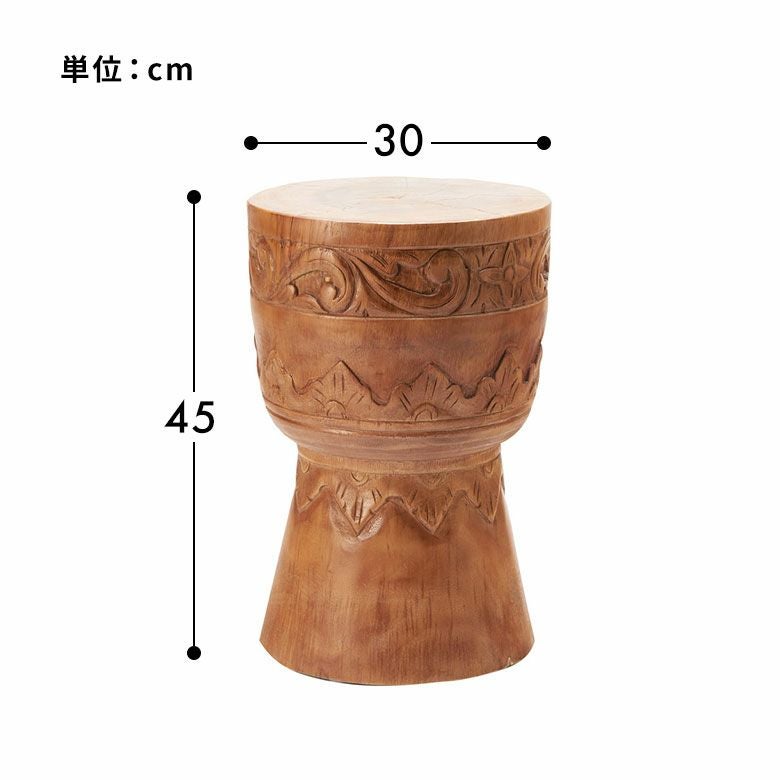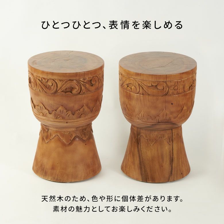 職人の手作業による独特の彫刻模様は、アジアンリゾート風の雰囲気を演出します。天然木ならではの木目模様と調和し、ひとつとして同じものがない味わい深い一台です。