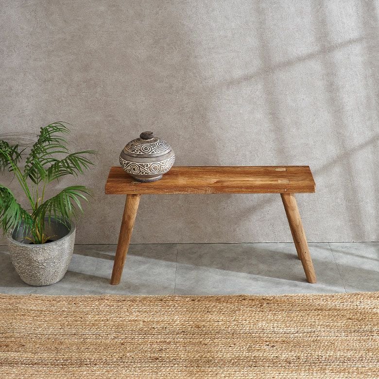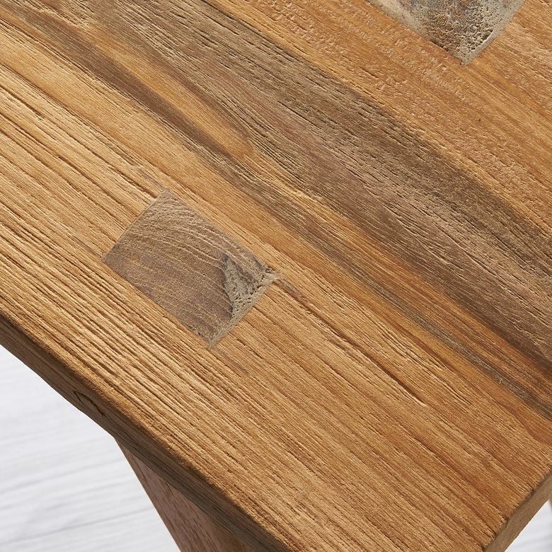 リクレイムドウッド(古材)を再利用して作られた、チーク材のベンチ。