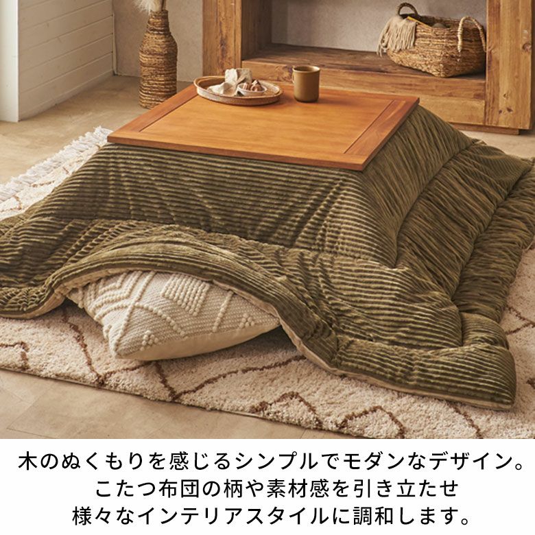 天然木アカシアのぬくもり、やさしい風合いを感じられる、直線的でシンプルなデザインの正方形こたつテーブル。落ち着いたカラーと上質な木目、サラサラとしたやさしい手触りを感じられるオイル仕上げです。木のぬくもりを感じるシンプルモダンなデザインは、こたつ布団の柄や素材感を引き立たせ、様々なテイストのインテリアにマッチします。