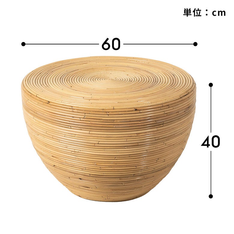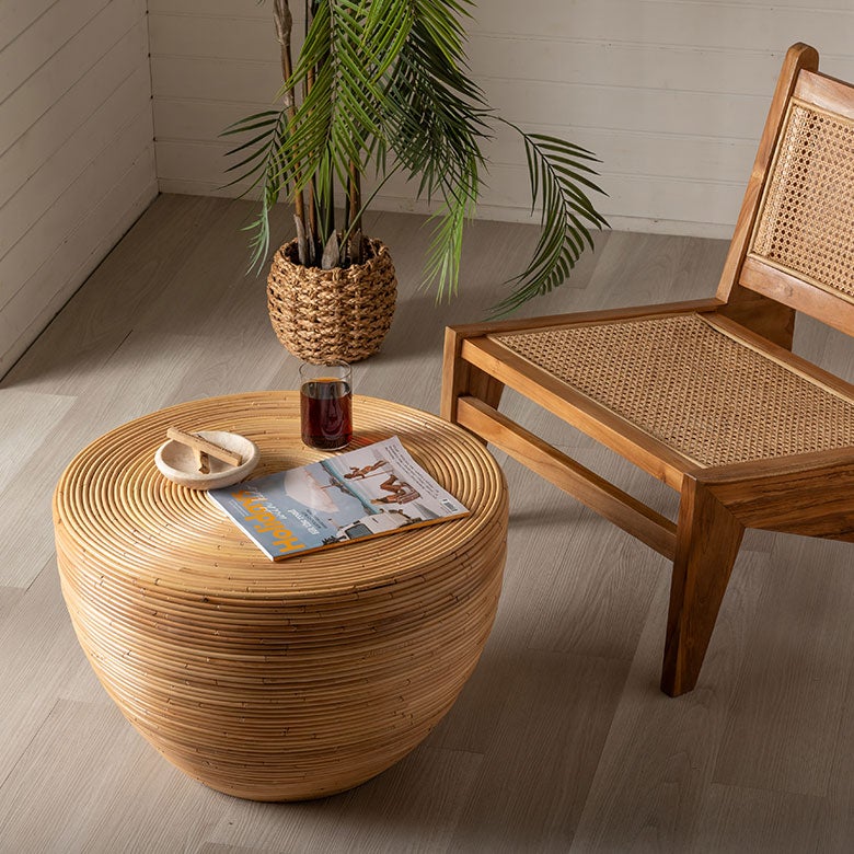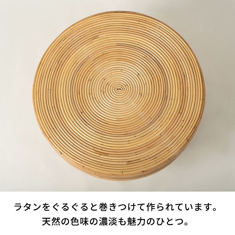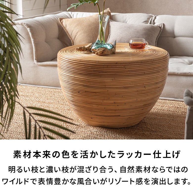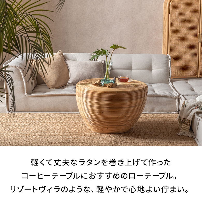 バリ島(インドネシア)を代表する家具のひとつ、ラタンの芯(コア)を円形に巻き上げてつくるローテーブル。リゾートヴィラで見かける、あの軽やかで心地よい佇まいを、日本の住空間に取り入れやすいサイズで仕上げました。