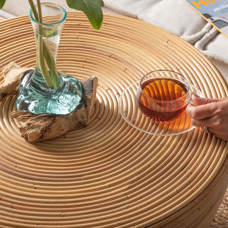 使用しているのは、樹皮を残した100%皮付きラタン。表面が丈夫で、汚れや染みが付きにくく、日常使いのコーヒーテーブルとして実用性に優れています。ラタンは柔軟性が高く、木材のように乾燥で割れることがありません。湿度の高い日本の気候にも適した、長く付き合える天然素材です。