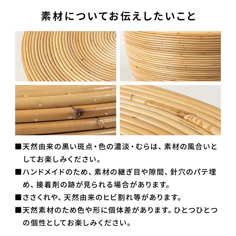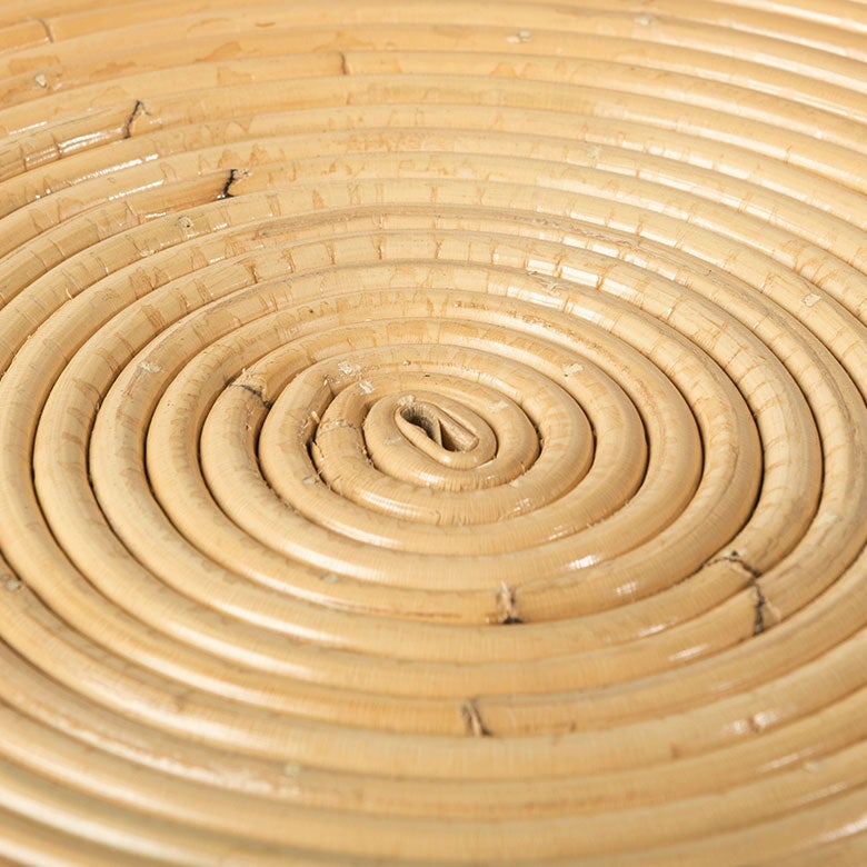 ラタンの枝を円形に曲げ、重ねていくスパイラル構造。複数のラタン枝を使用しながらも、太さの近い枝を選び、皮付きラタンの自然な濃淡を活かすことで、継ぎ目がほとんど目立たない美しい一体感を実現しています。
