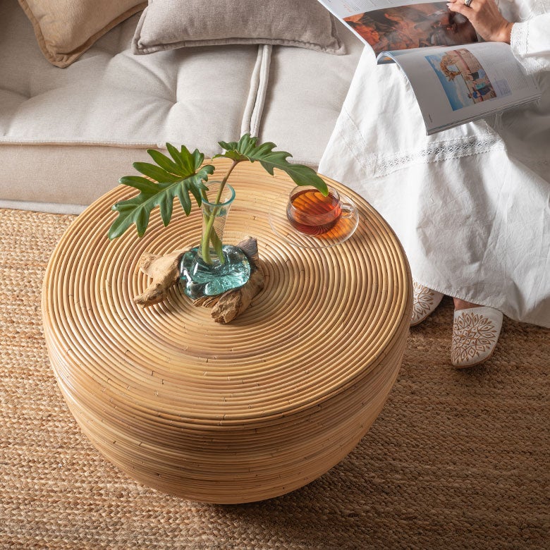 使用しているのは100%皮付きラタン。表面が丈夫で汚れにくく、日常使いのコーヒーテーブルとしても実用的。さらに約5.5kgと軽量で、移動や模様替えもスムーズに行えます。
