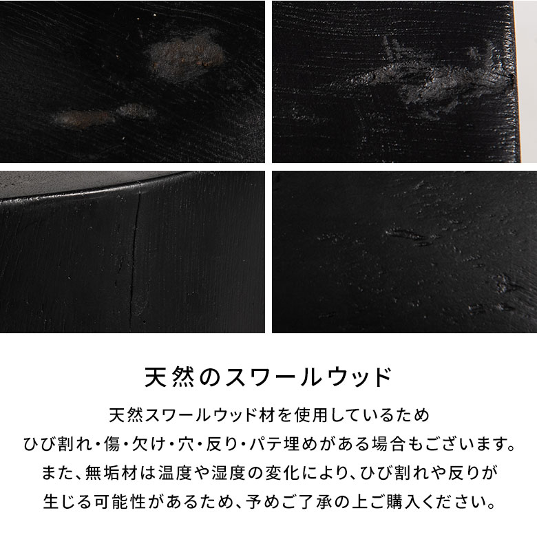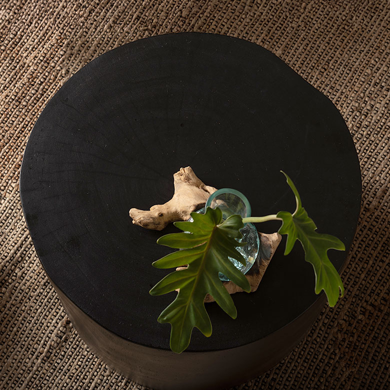 直径50cm以上の成木から削り出された、約W50×D50×H40cmの圧倒的なスケール感。無垢材が生む重厚感ある佇まいが、空間の中心に静かな存在感を放ちます。