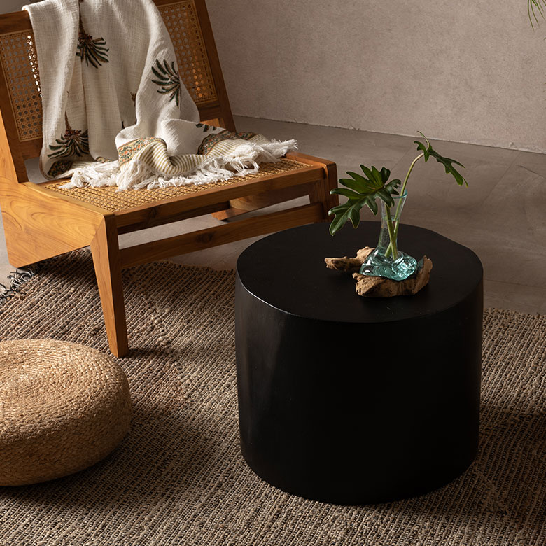 マットブラックの落ち着いた色合いと天然木ならではの個性的な木目で、リビング空間に上質なアクセントを添えるコーヒーテーブルとして。