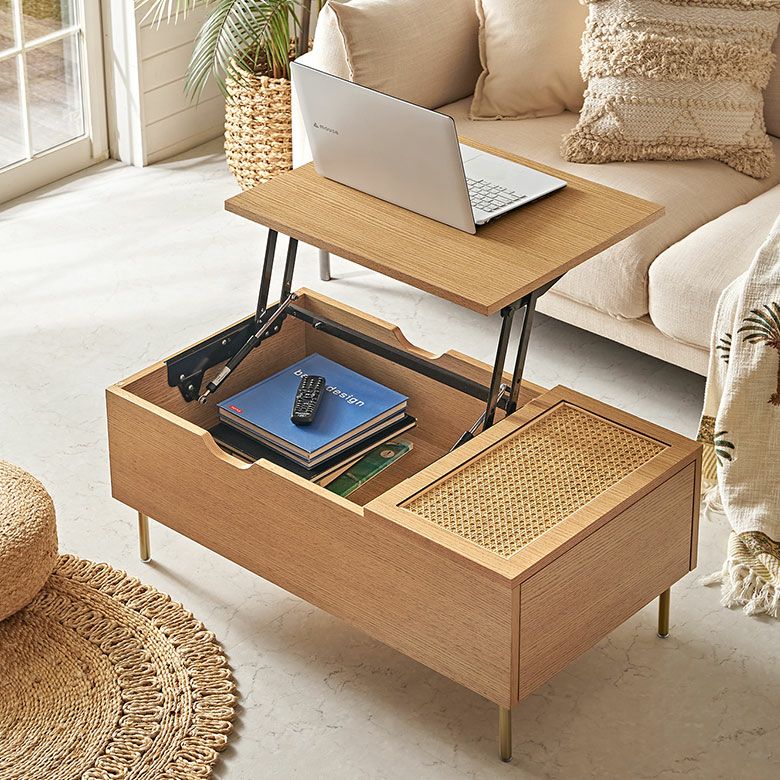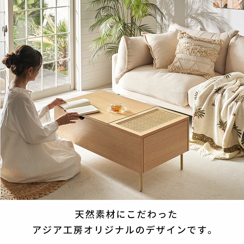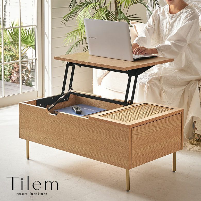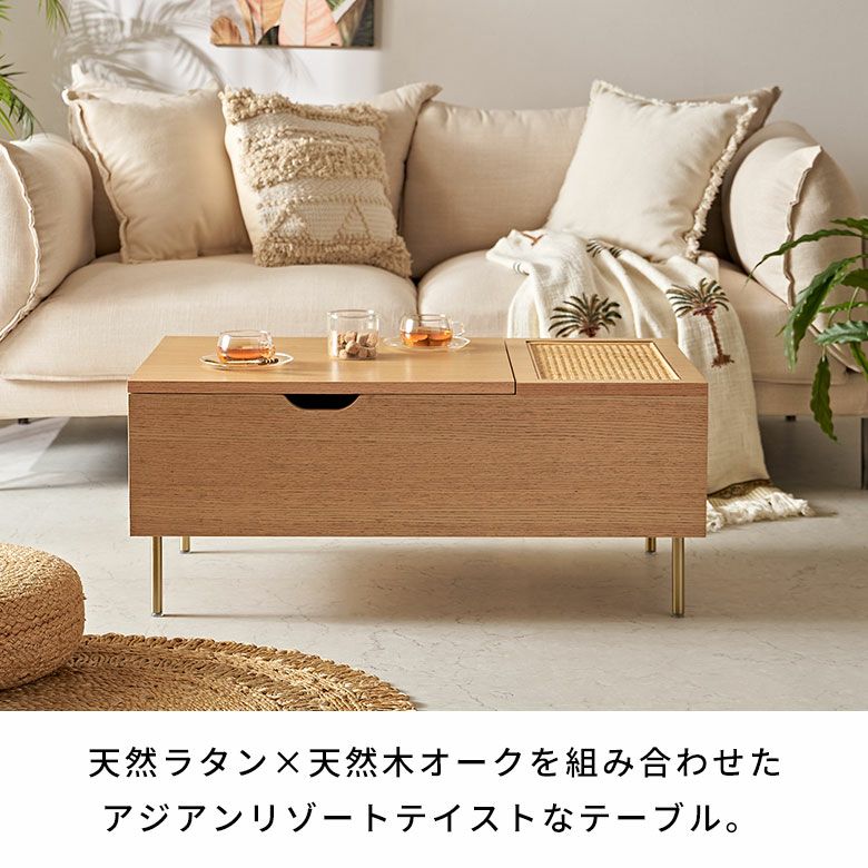 カゴメ編みラタン×ウッドの天然素材カラーの魅力的なコンビネーションで、上品さと洗練感を放つリゾートファニチャー「Tilem」の収納付きソファテーブル。