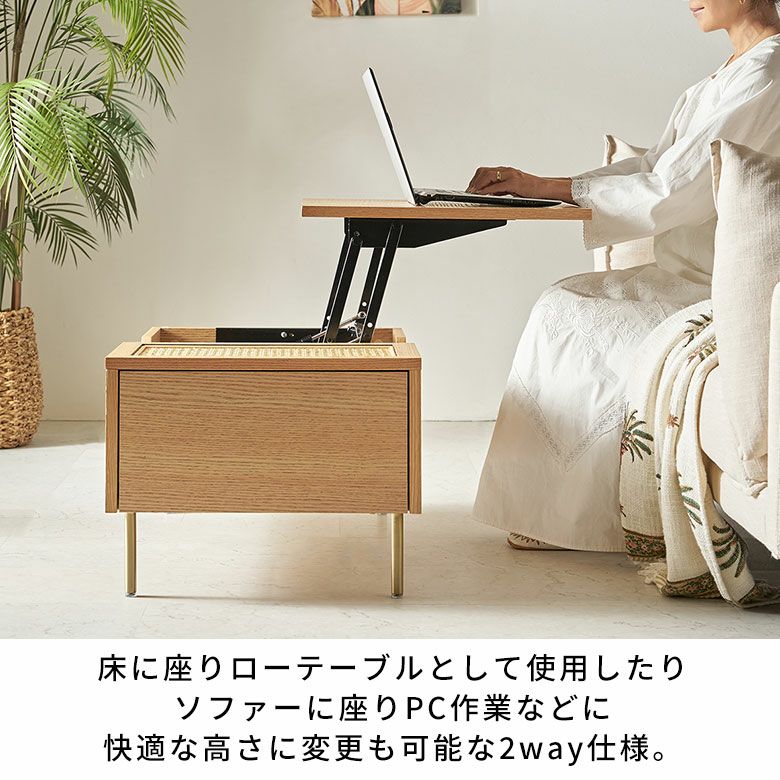 ・床に座りローテーブルとして使用したり、ソファーに座りPC作業などに快適な高さに変更も可能な2way仕様