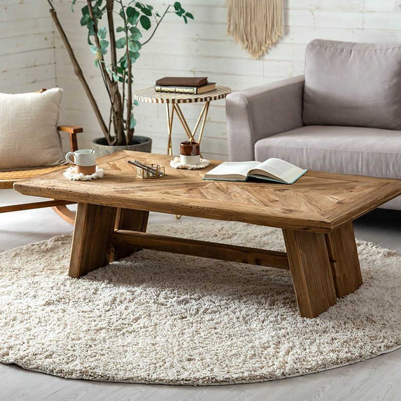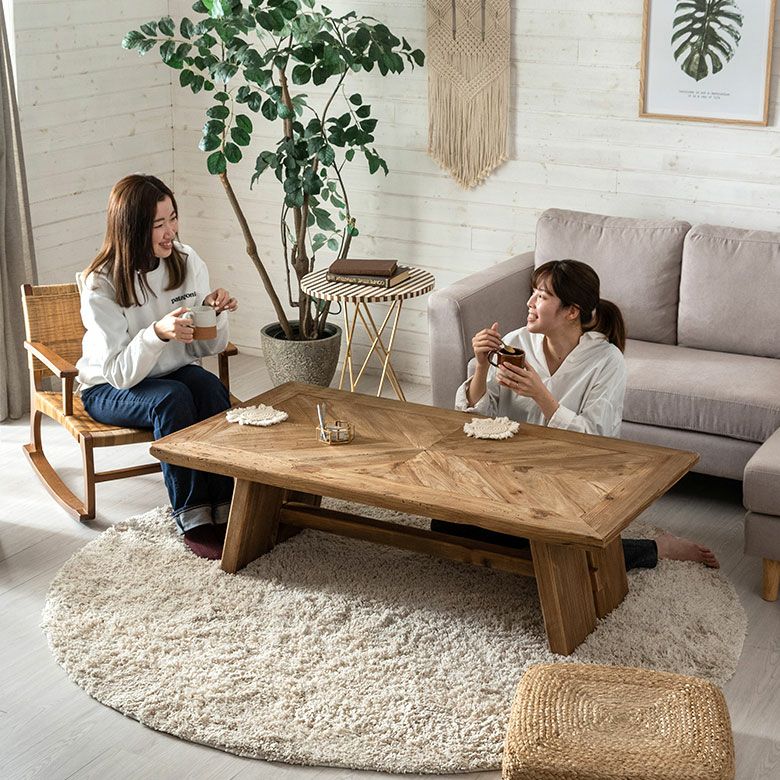 どっしりとした重厚感とラスティックな素材感が特徴的なリビングテーブル。