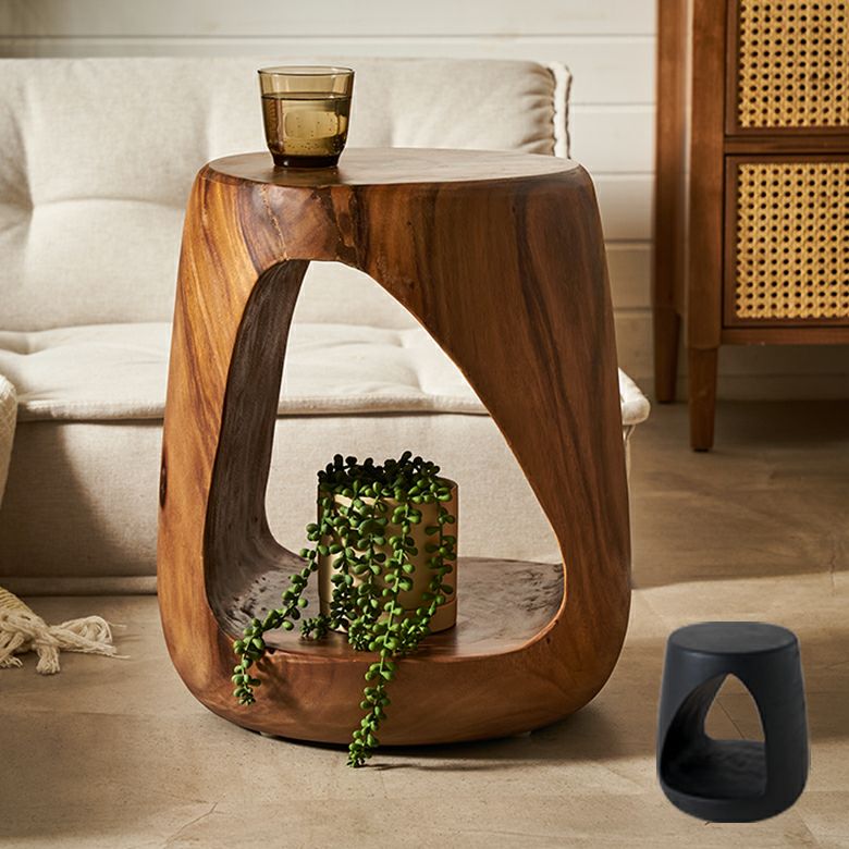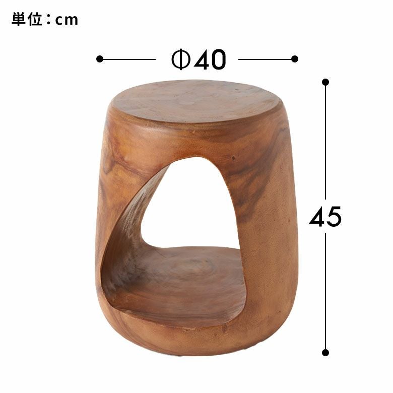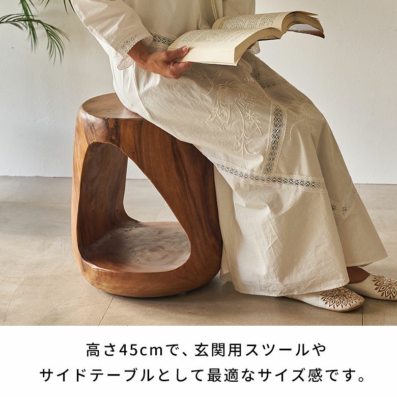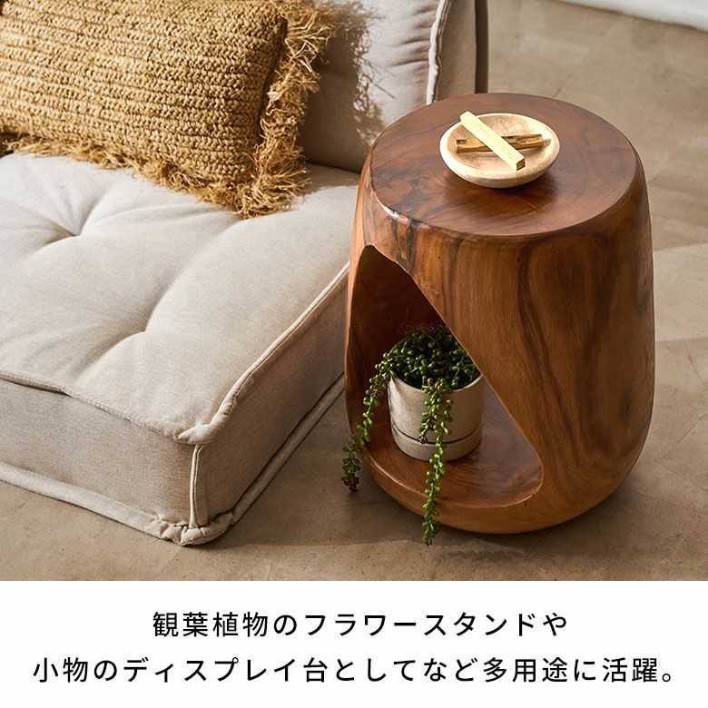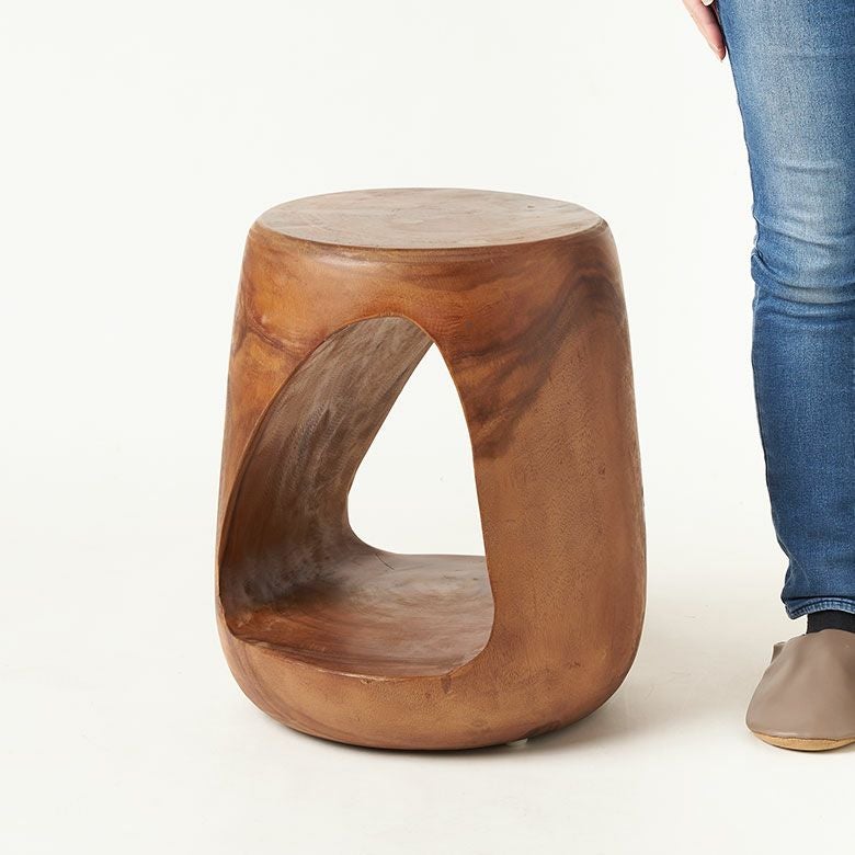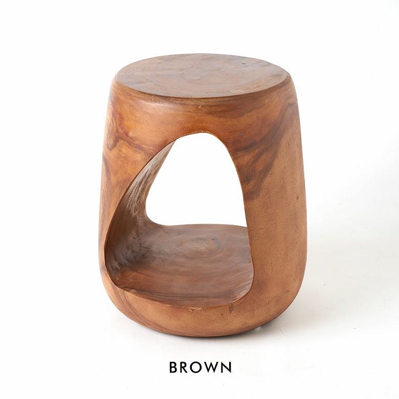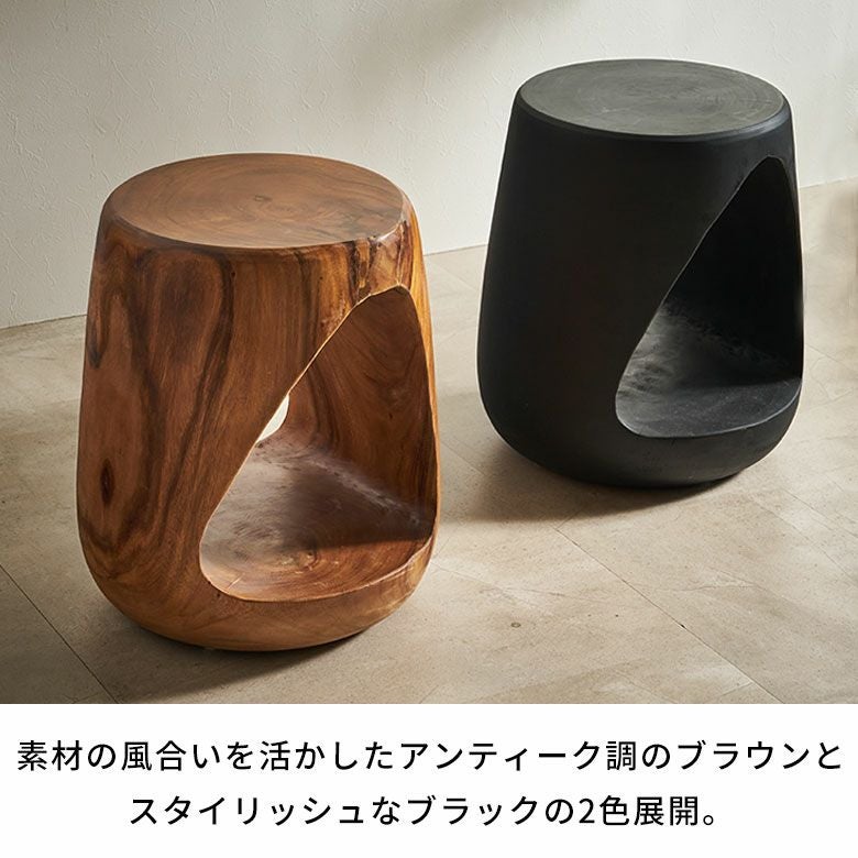 カラーは2色展開。ブラウンは経年変化を楽しめるアンティークフィニッシュ、ブラックはスタイリッシュでありながら天然素材の温もりを感じさせる仕上げです。スツールとしてはもちろん、サイドテーブルやプランタースタンドなど多用途に活躍。個性的なフォルムは、アジアン、リゾート、和モダンなど幅広いインテリアに調和します。木の温もりと職人技が、空間に安らぎと高級感をプラス。