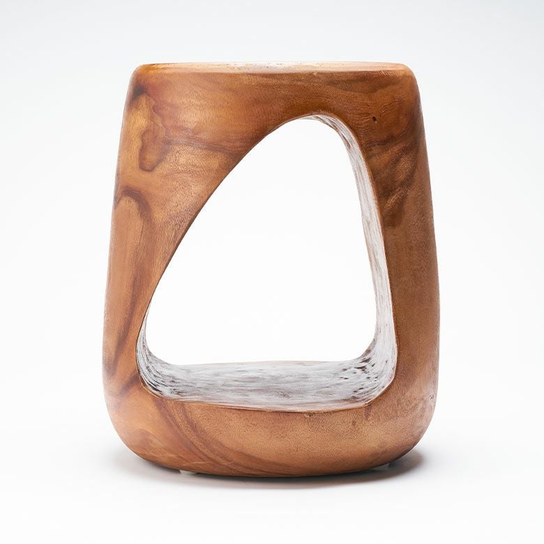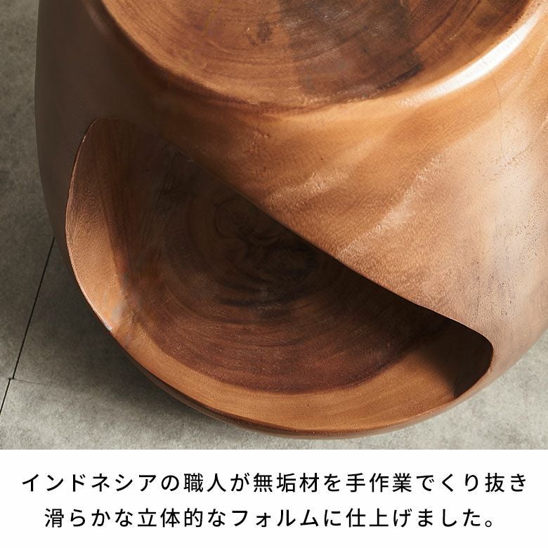 モンキーポッドツリー(スワールウッド)を贅沢に使った、流れるような曲線が彫刻のように美しいウッドスツール。南米ウォルナットとも呼ばれるモンキーポッドは、濃茶色の美しい木目と温かみのあるナチュラルな質感が特徴です。インドネシアの職人が無垢材を手作業でくり抜き、滑らかで立体的なフォルムに仕上げました。その唯一無二のデザインが、空間に洗練された存在感をもたらします。