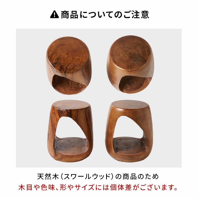 スワールウッドは、中南米を原産とし、ポルトガル人によりインドネシアに移植されたモンキーポッドの現地名です。「南米ウォルナット」とも呼ばれる濃茶色の美しい木目と温かみを感じるナチュラルな質感が特徴で、家具や民芸品に幅広く活用されています。ダイナミックな木目のコントラストが、空間に自然な温かみと個性を与えます。長い年月をかけて育った大木から切り出し、木本来の持つ美しさをそのまま活かしたスツールは、唯一無二の存在感を放ちます。一生使える家具として、暮らしに素敵な彩りを添えてくれます。