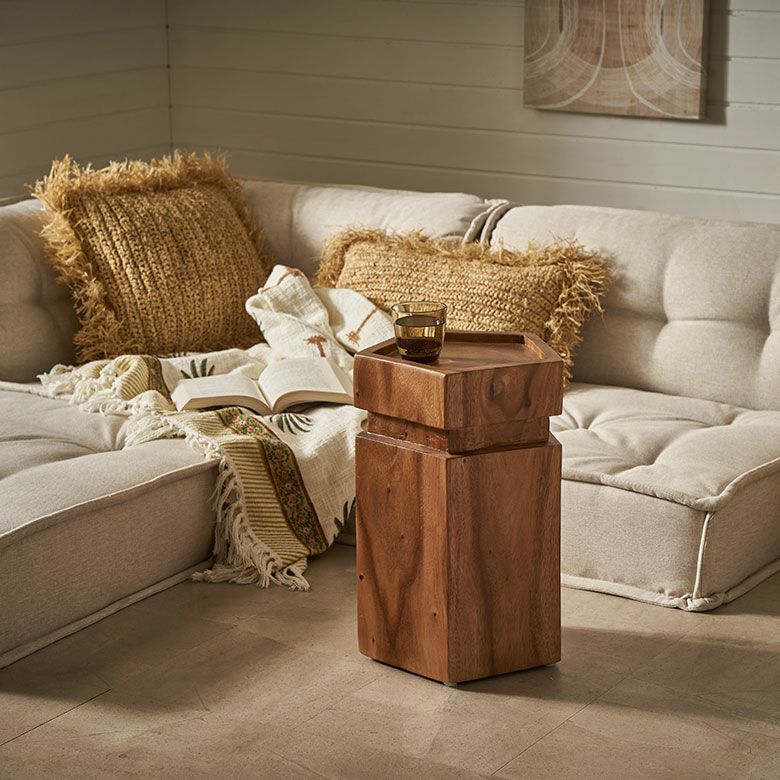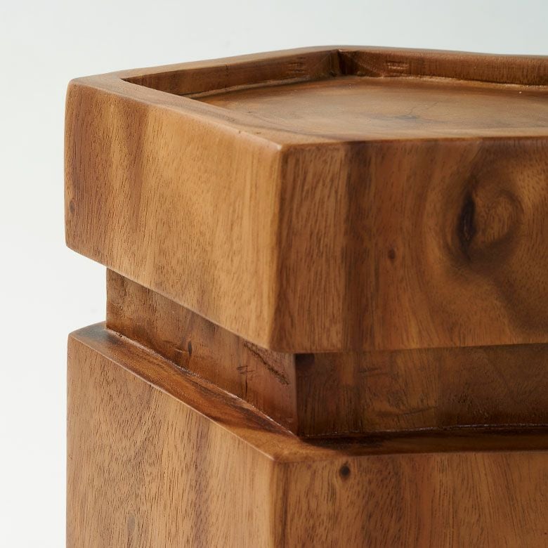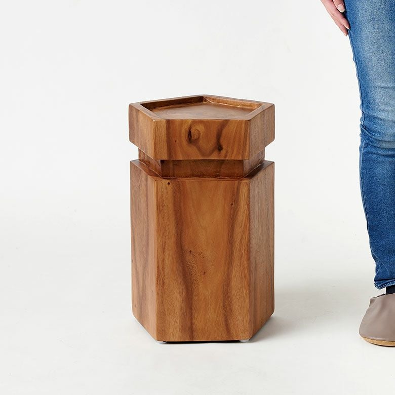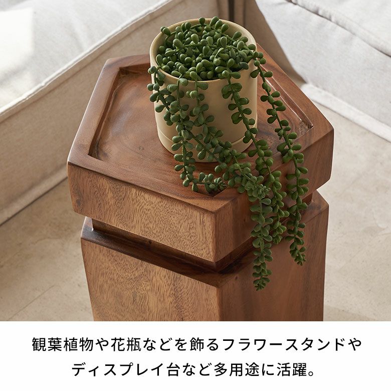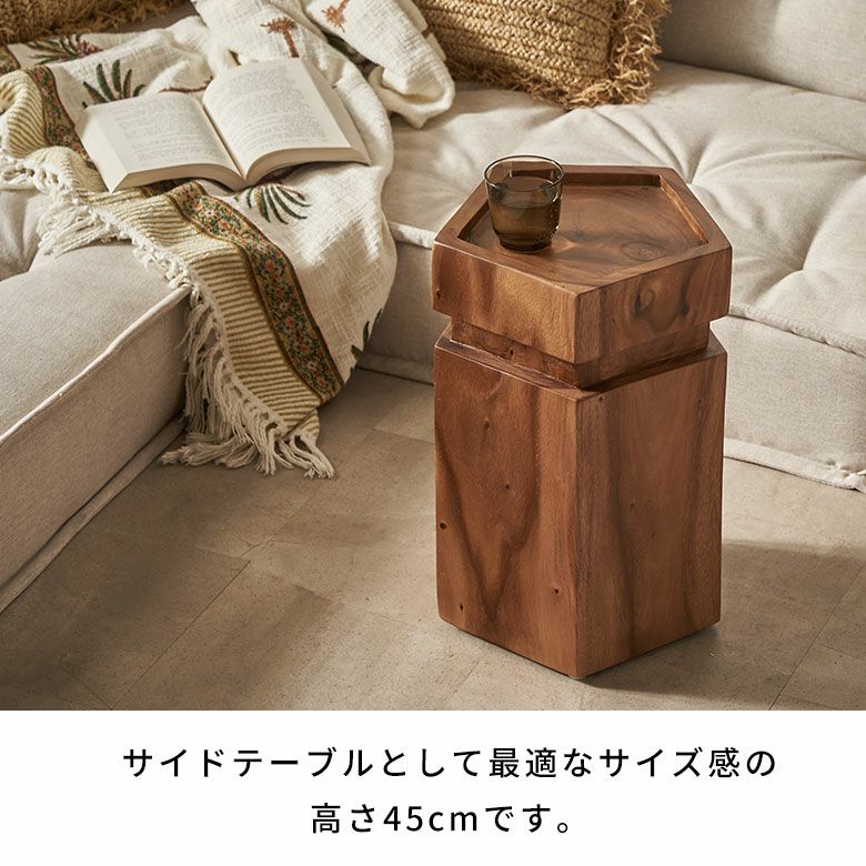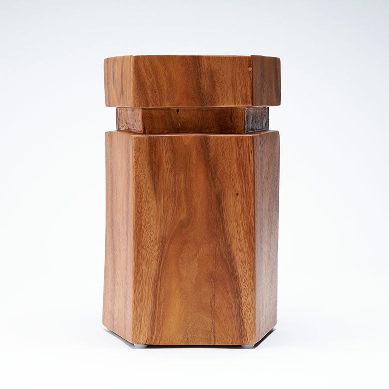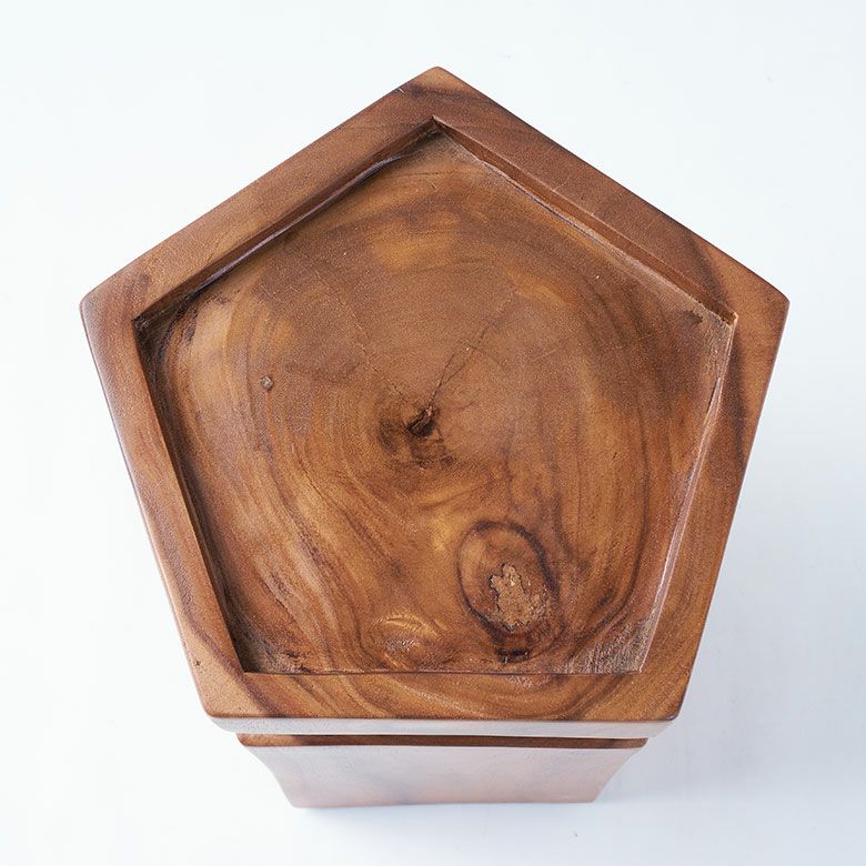 モンキーポッドツリー(スワールウッド)を贅沢に使用した、スタイリッシュなペンタゴンシェイプのサイドテーブル。無垢材の割れや風合いを活かしたヴィンテージライクなデザインが魅力です。南米ウォルナットとも呼ばれるモンキーポッドは、濃茶色の美しい木目と温かみのあるナチュラルな質感が特徴です。インドネシアの職人の手作業で作り上げたサイドテーブルは、無垢材ならではの滑らかな仕上がりと、唯一無二の存在感を持ちます。内側を空洞にすることで軽量化しつつも、重厚感をしっかりと感じられる構造になっています。