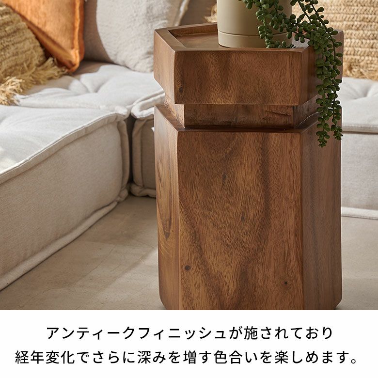 アンティークフィニッシュが施されており、経年変化でさらに深みを増す色合いを楽しめます。サイドテーブルとしてはもちろん、フラワースタンド、アートピースとしても活躍。オブジェのようなフォルムは、置くだけで洗練されたアジアンリゾートの雰囲気を演出します。