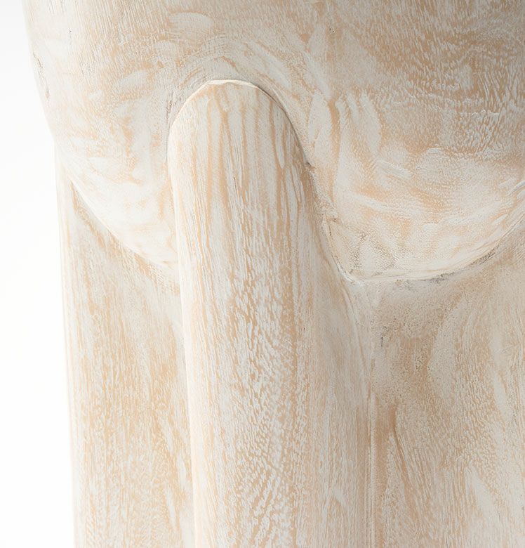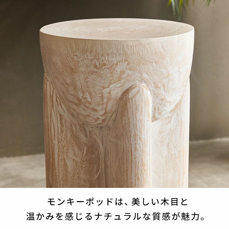 モンキーポッドツリー(スワールウッド)をインドネシアの熟練の職人がひとつひとつ丁寧に削り出し、半球状の座面とクロス脚のユニークなデザインに仕上げたスツール。南米ウォルナットとも呼ばれるモンキーポッドは美しい木目が特徴です。自然の力強さと美しさを感じる木目を最大限残しながらホワイトウォッシュ加工を施したスツールは、空間に馴染みながらも天然木材ならではの風合いと温もりをお楽しみいただける逸品です。無垢材から削り出されたつなぎ目のないデザインは、他にはない高級感と唯一無二の存在感を演出します。