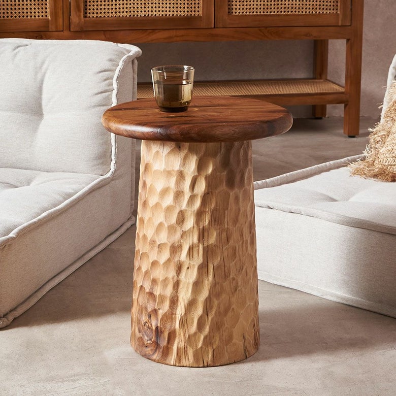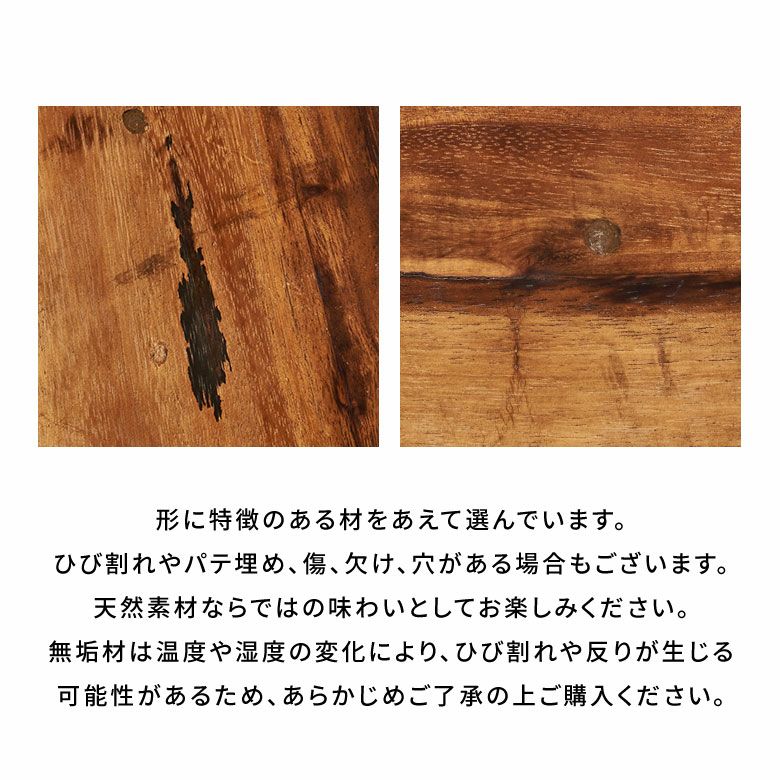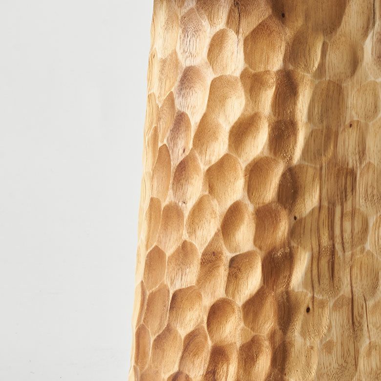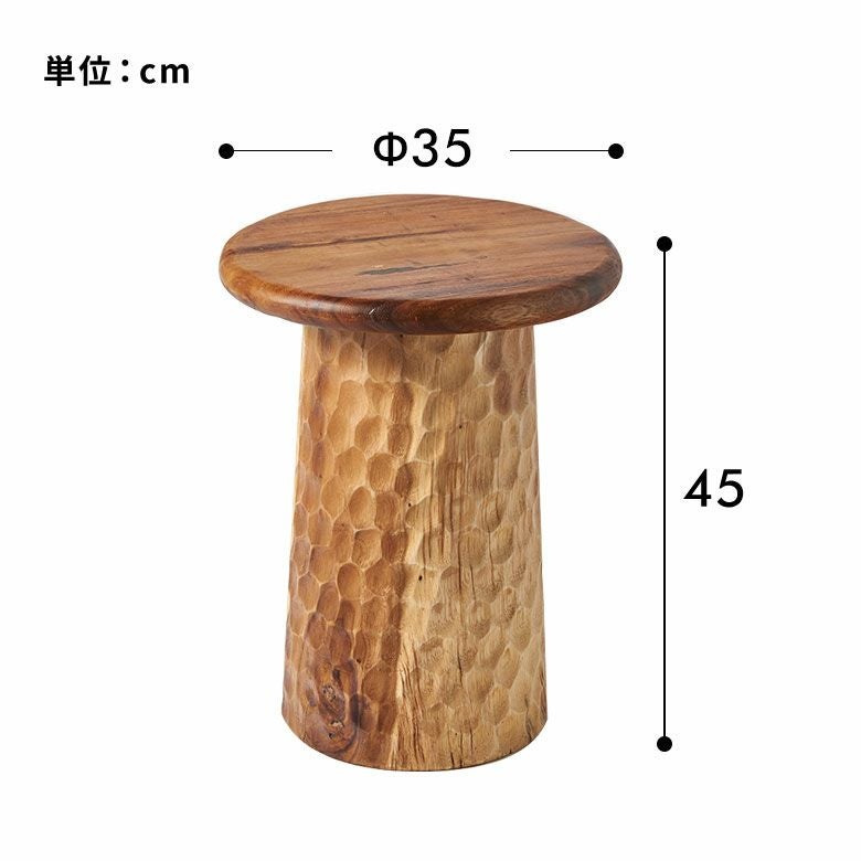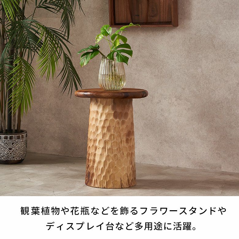 天板と加工を変えて、脚部分は日本の名栗加工のようなデザイン。インドネシアの職人のカービング技術が光る逸品です。