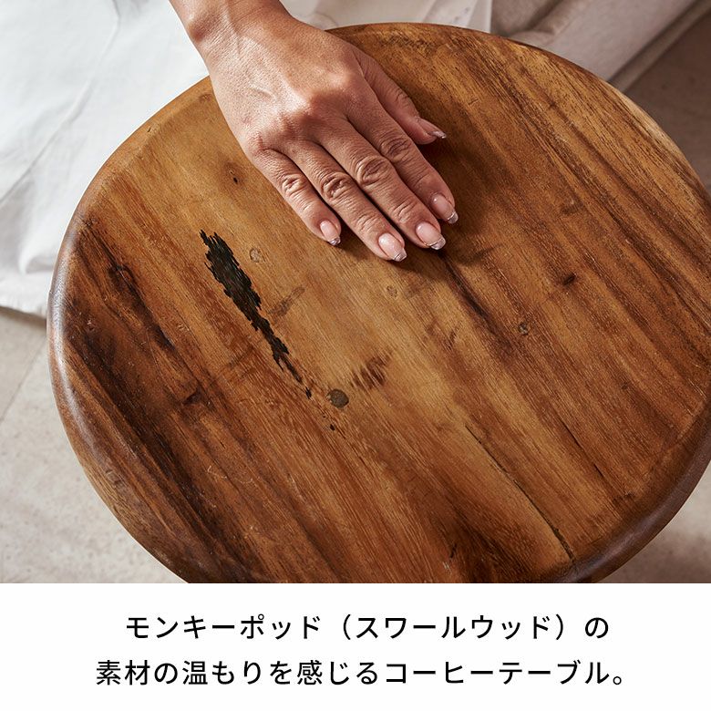 釘やねじを一切使わず、インドネシアの職人たちのカービング技術と木製ダボのみで作られた100%ナチュラルなコーヒーテーブル。ラフ仕上げで素材感を活かした仕上がりになっています。