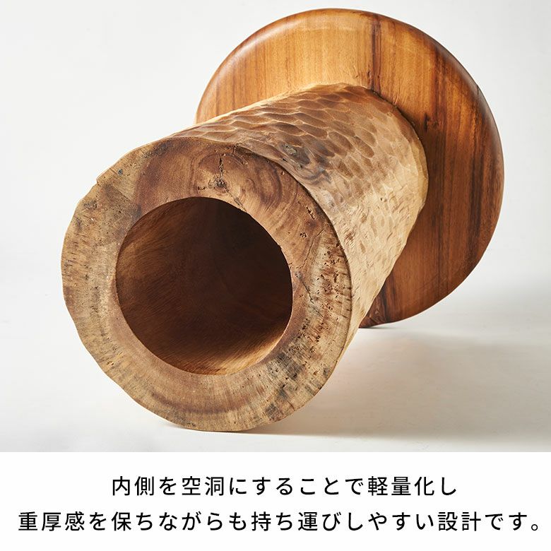 しっかりとした造りながら、内側をくり抜くことで軽量化されており、移動もらくらく。ソファの横でサイドテーブルとしての使用はもちろん、リビングで植物を飾る花台としたり、店舗のインテリアとしても活躍します。使い方はあなた次第。