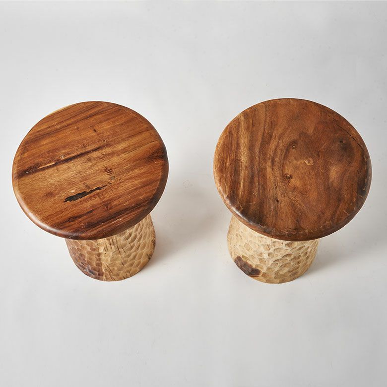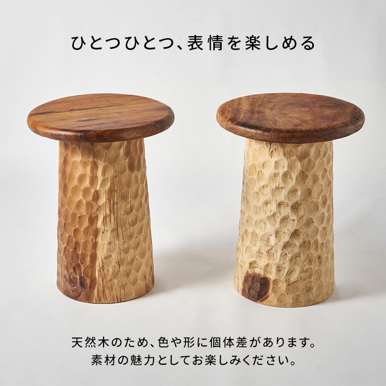 ダイナミックな木目のコントラストが、空間に自然な温かみと個性を与えます。長い年月をかけて育った大木から切り出し、木本来の持つ美しさをそのまま活かしたスツールは、唯一無二の存在感を放ちます。一生使える家具として、暮らしに素敵な彩りを添えてくれます。