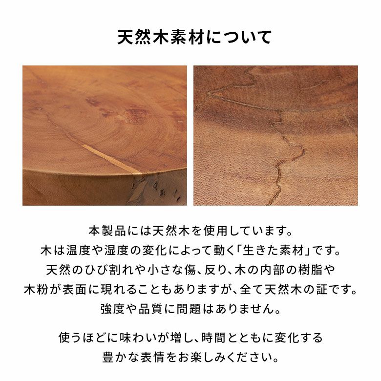 リズムを感じさせる独特のフォルムは、空間にアートピースのような印象を添えるデザイン。さらに、ひとつとして同じものがない木目の表情が一点物の魅力を生み、特別感のあるインテリアを演出します。