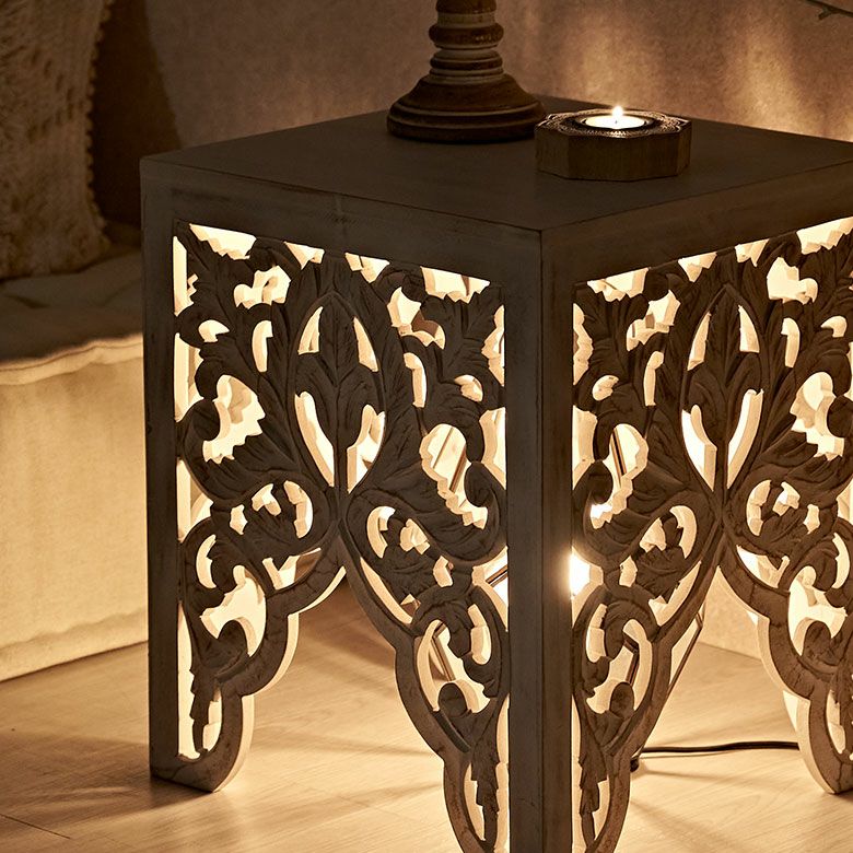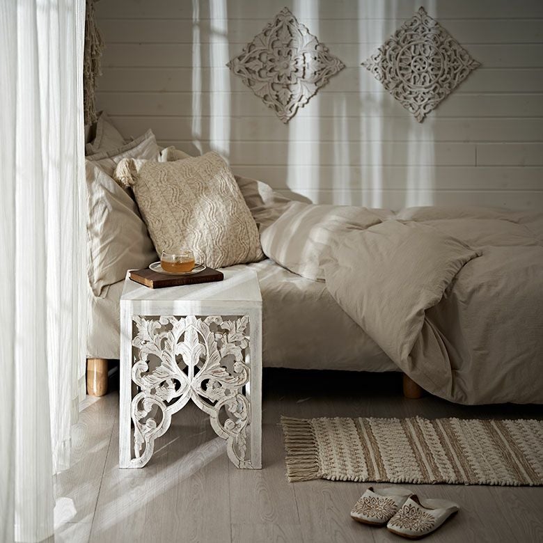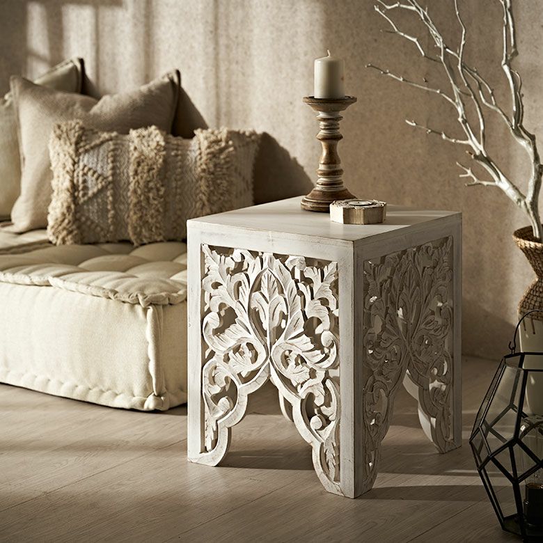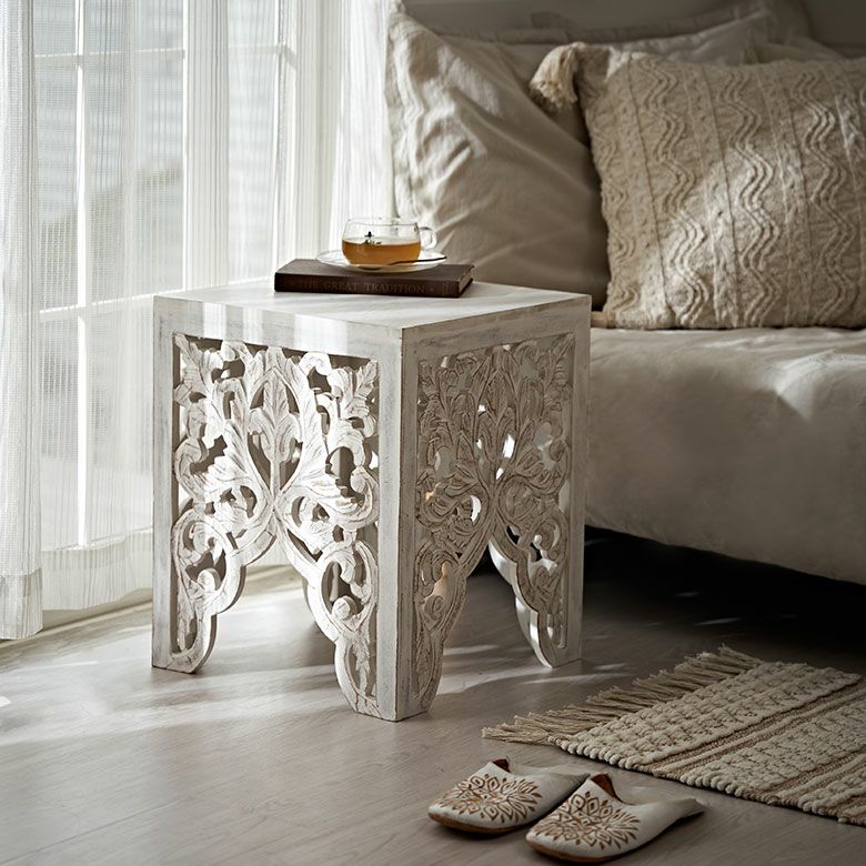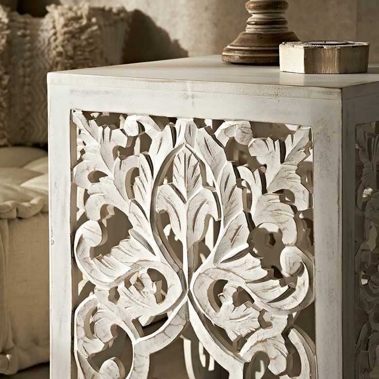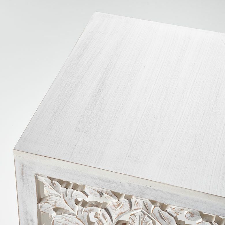 ハンドメイド ナチュラル アンティーク風 フラワー 花 サイド ソファーテーブル 飾り棚 什器 アジアンリゾート ホテル 店舗 レストラン カフェ お店 引っ越し 祝い ギフト プレゼント サイドテーブル テーブル インド 製 約 W 35 × D 35 × H 42 cm ホワイト ウォッシュ ナイトテーブル ソファテーブル オブジェ 透かし彫り レリーフ カービング 寝室 ベッドルーム リビング 玄関 家具 おしゃれ 北欧 リゾート エスニック アジアン モロッカン [34578]
