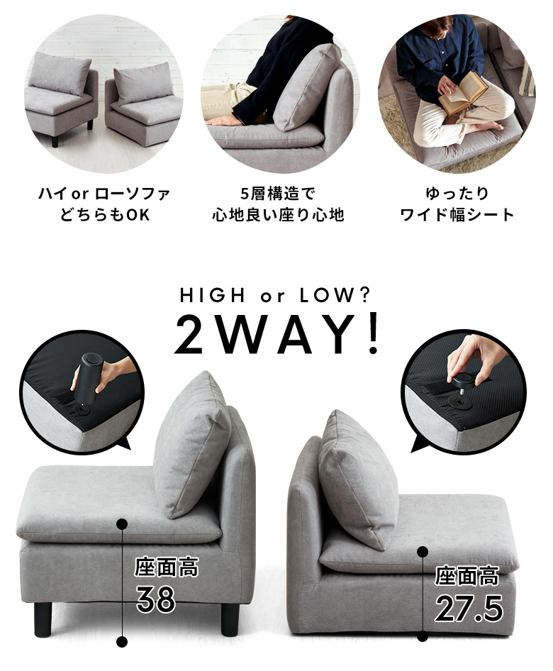 ・脚パーツを付け替えて、ハイソファとしてもローソファとしても使用できる2wayデザイン