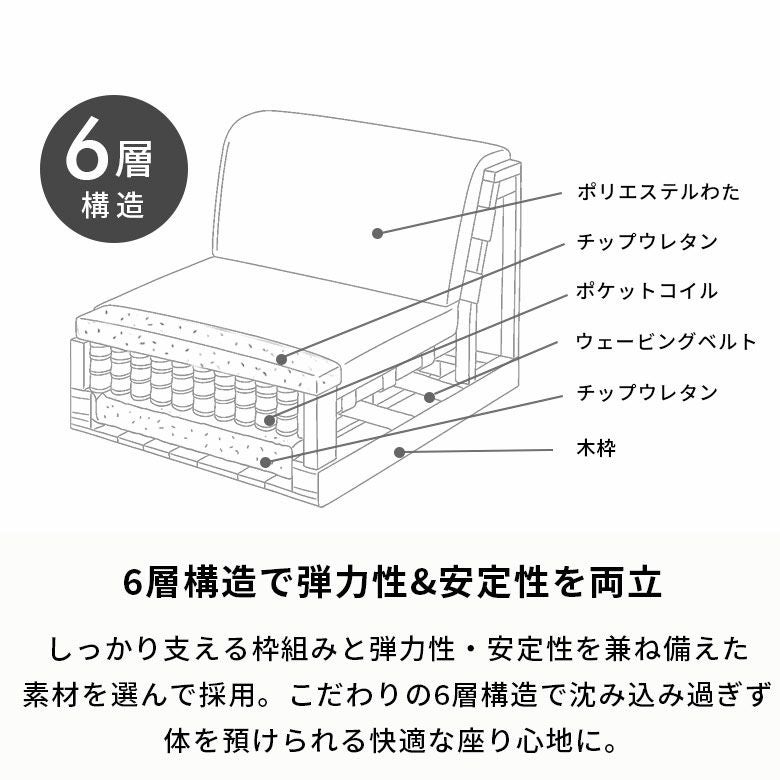 しっかり支える枠組みと弾力性・安定性を兼ね備えた素材を選んで採用。 こだわりの6層構造で沈み込すぎず、体を預けられる快適な座り心地に。
