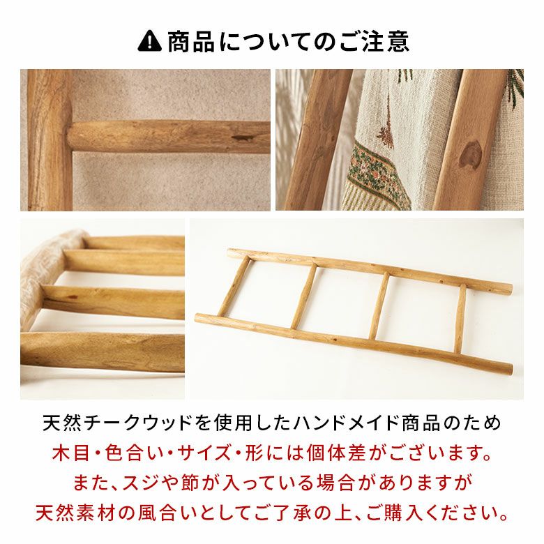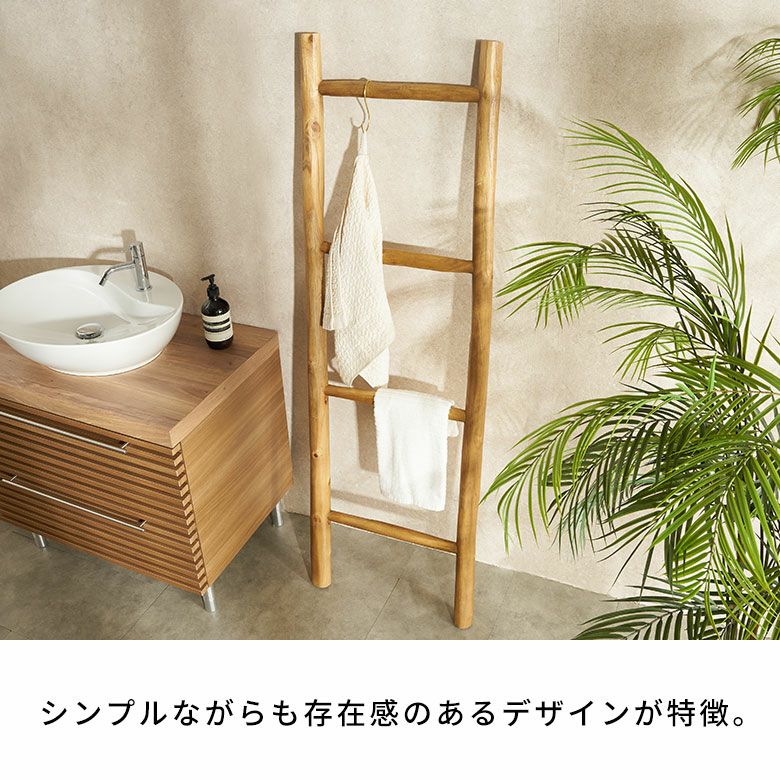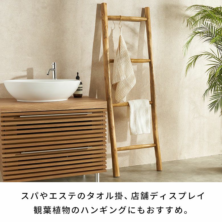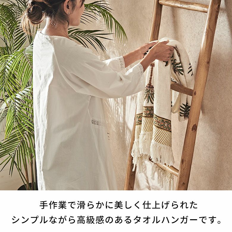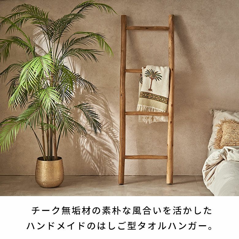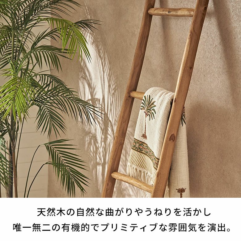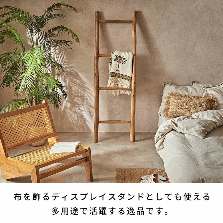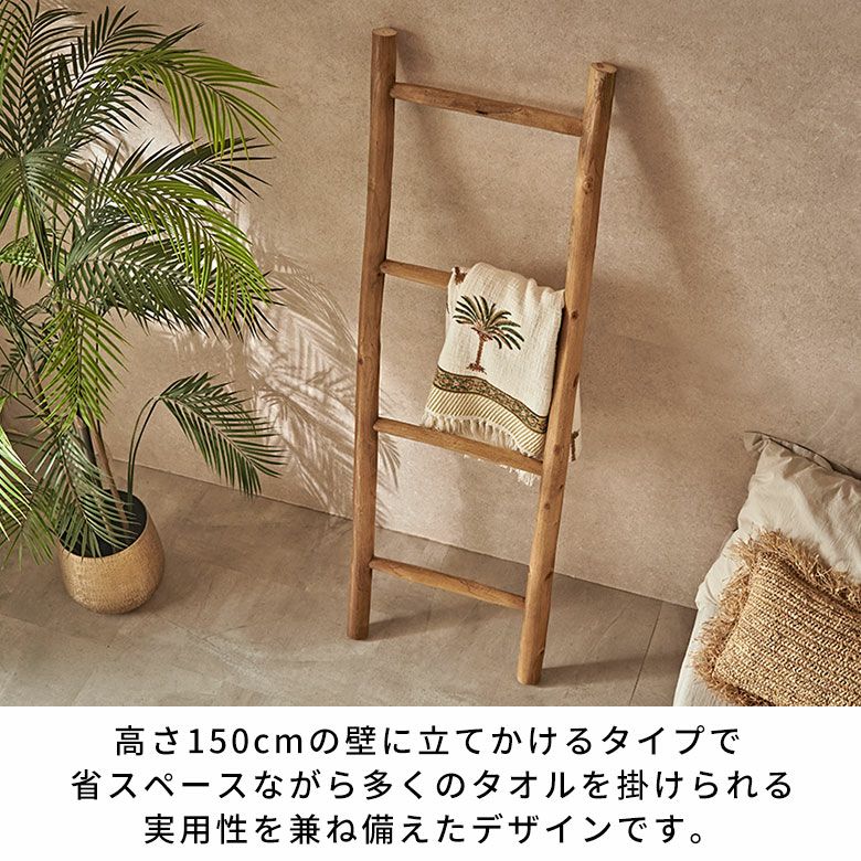 高さ150cmの立てかけタイプで、省スペースながら多くのタオルを掛けられる実用性も兼ね備えています。バリ風アジアンスタイルはもちろん、北欧のナチュラルなインテリア、和モダンにもマッチします。スパやエステのタオル掛け、店舗ディスプレイ、ストールや観葉植物の吊り下げ収納にもおすすめの、多用途で活躍する逸品です。
