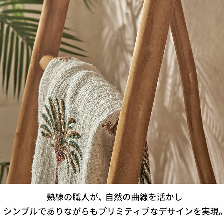 チーク無垢材を使用したスタイリッシュなタオルハンガーは、耐久性と耐水性に優れた高級素材を採用しています。熟練職人が自然の曲線を活かし、シンプルでありながらプリミティブなデザインを実現しました。後部の支柱を広げることで自立するタイプで、壁に立てかける必要がなく、設置も簡単です。ナチュラルで温かみのある木目はワックス仕上げで強調され、時と共に深みを増す風合いに変化します。