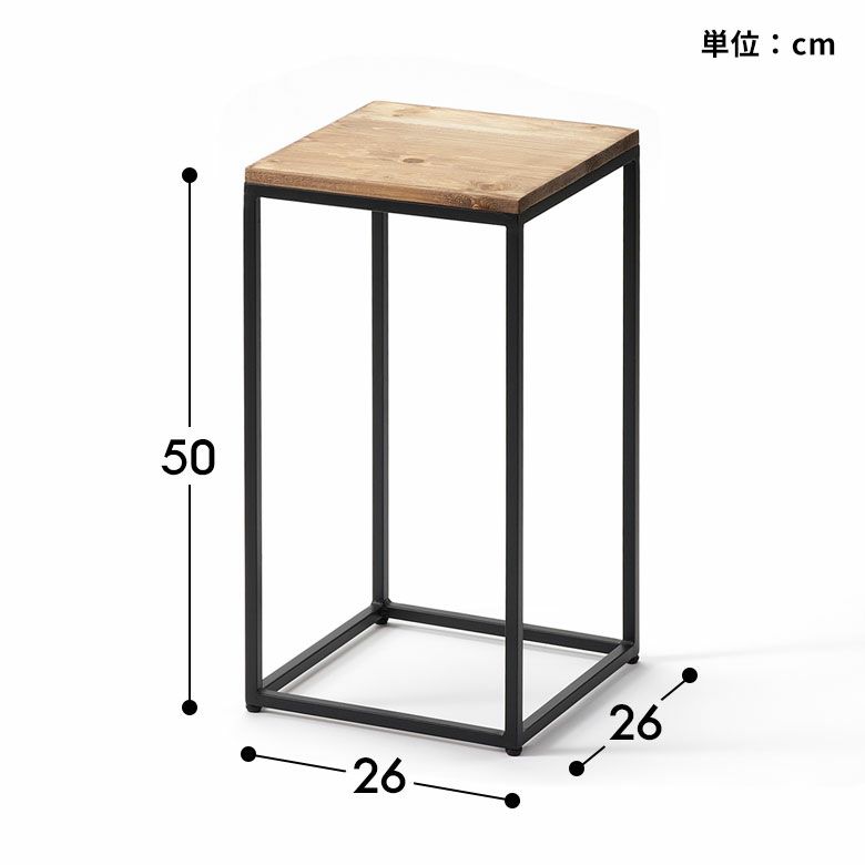 アップサイクルのパインウッド材とスリムなアイアンスタンドを組み合わせたスタイリッシュなデザインは、植物やオブジェを引き立て、空間をセンスよく演出。天板はあえて釘跡や傷を残し、ひとつひとつ異なる木目や風合いを味わえるのも魅力。アイアン部分にはパウダーコーティングを施し、耐久性とお手入れのしやすさを両立しています。