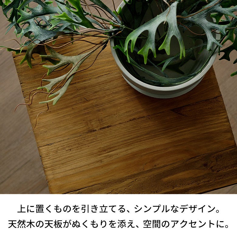 アップサイクルのパインウッド材とスリムなアイアンスタンドを組み合わせたスタイリッシュなデザインは、植物やオブジェを引き立て、空間をセンスよく演出。天板はあえて釘跡や傷を残し、ひとつひとつ異なる木目や風合いを味わえるのも魅力。アイアン部分にはパウダーコーティングを施し、耐久性とお手入れのしやすさを両立しています。