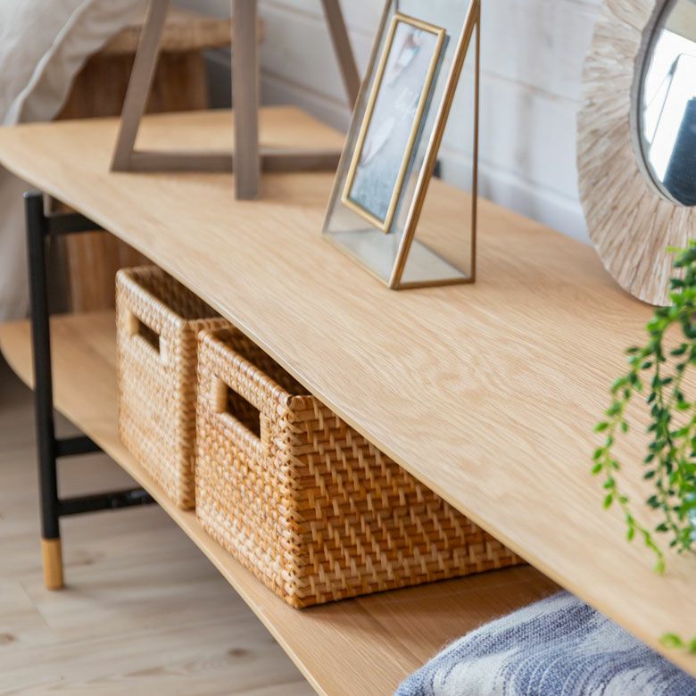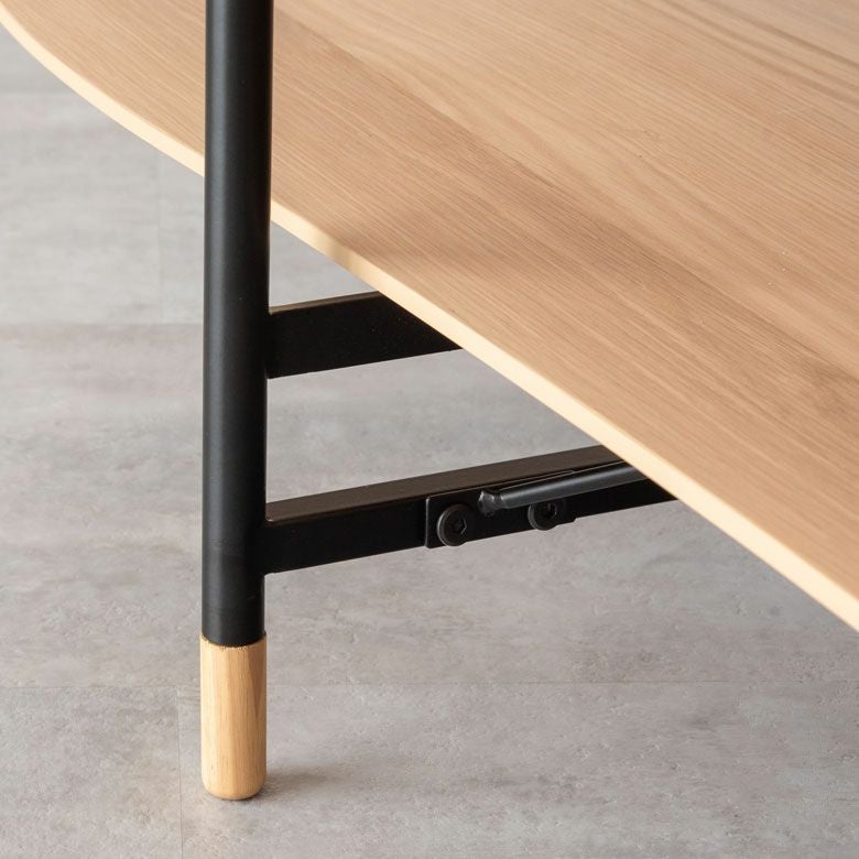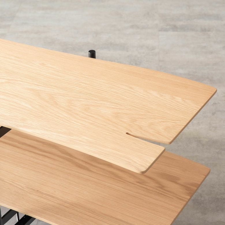 ウッドクラックを模した棚板の割れ目や、木材と同じカラーを施したフレーム脚など、