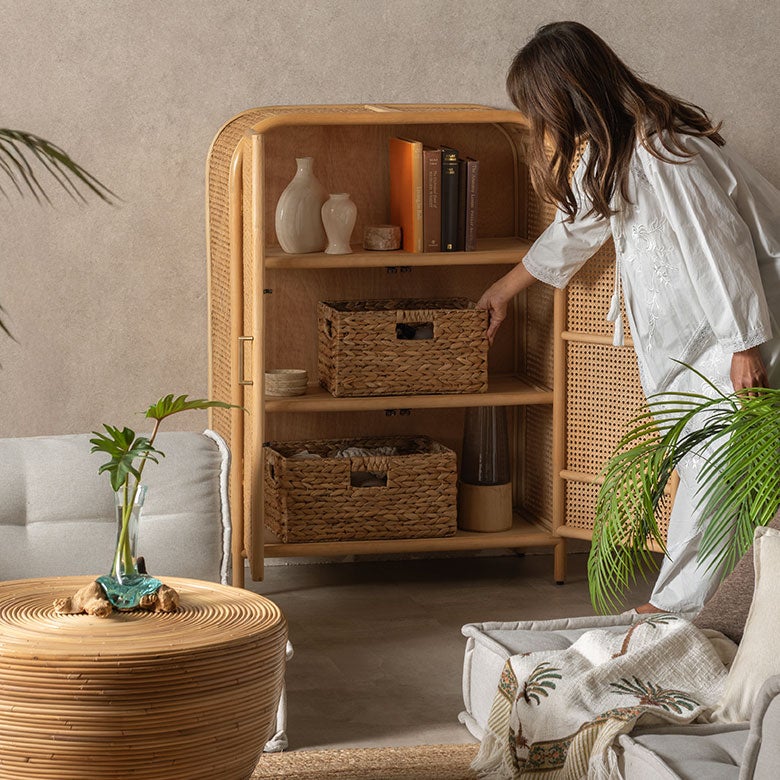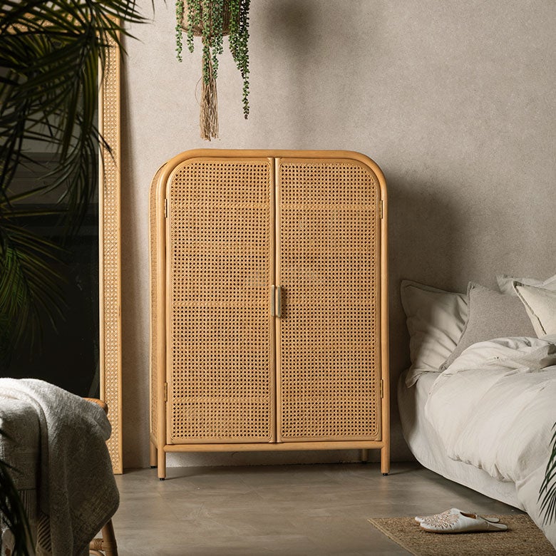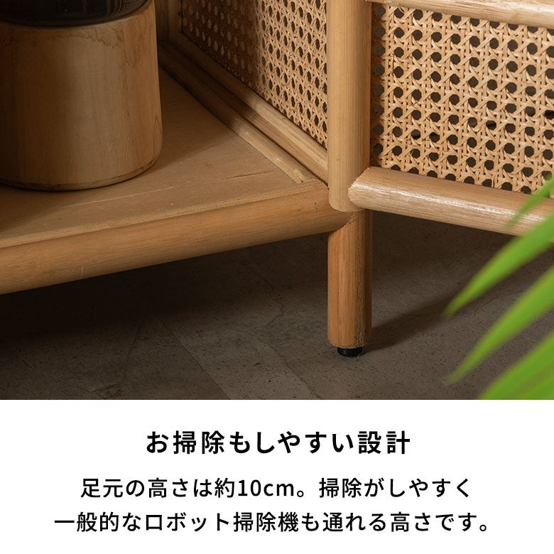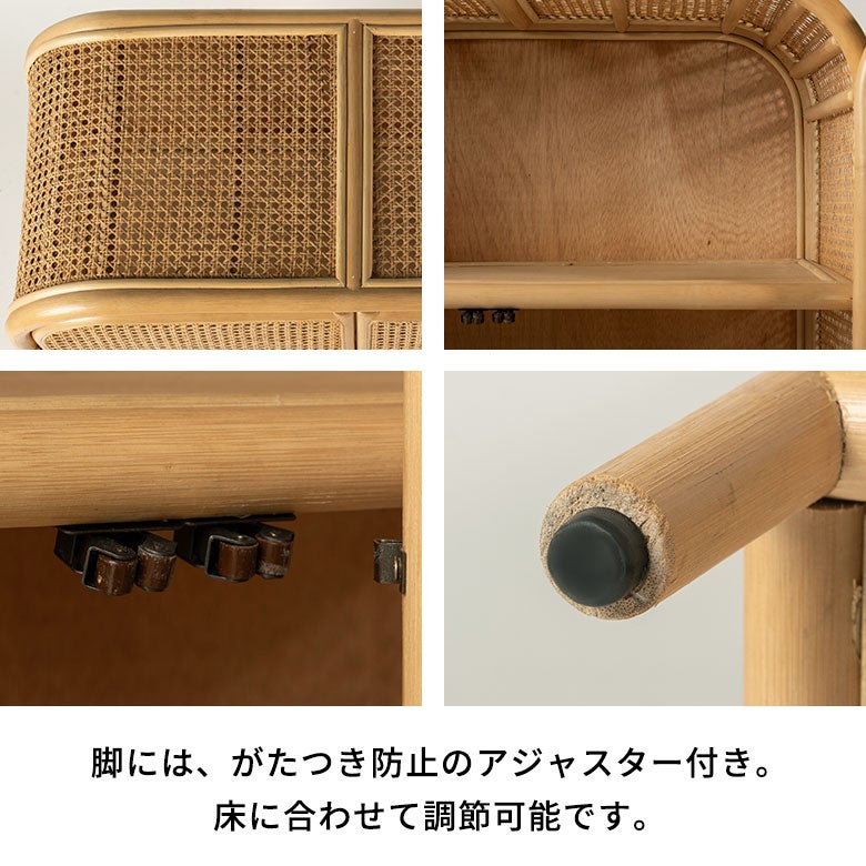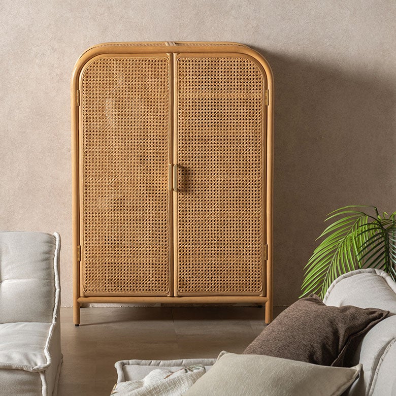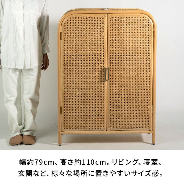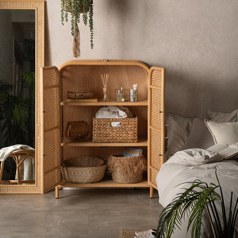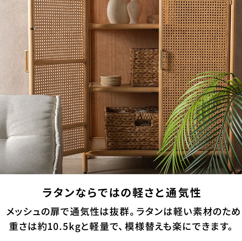 インドネシアで確立された製法により仕上げられ、軽量・通気性・耐久性という、ラタン素材ならではの魅力を最大限に活かした設計。見た目の美しさだけでなく、両開き扉と3段の収納スペースで日常使いにも優れた実用性を備えています。