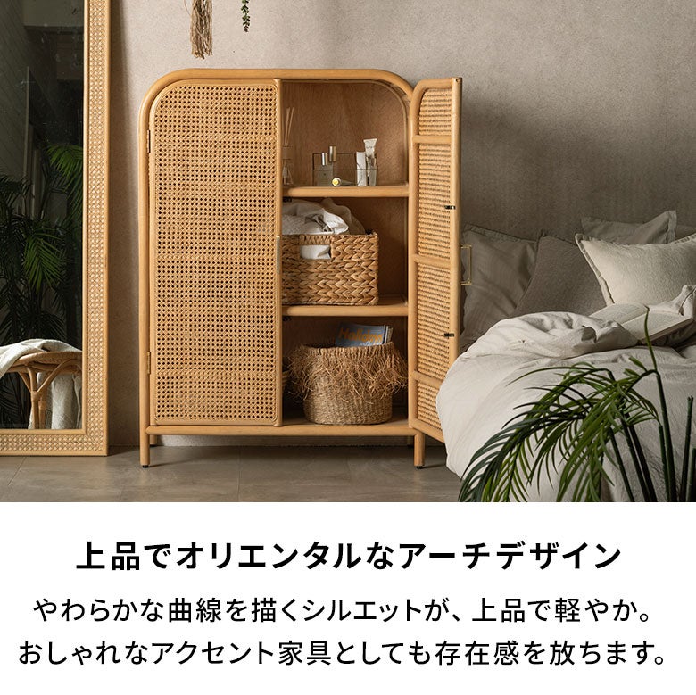 やわらかな曲線を描くアーチトップデザインが、ラタン素材の軽やかさを引き立て、上品でエレガントな印象を与えます。直線的になりがちな収納家具とは異なり、空間にオリエンタルな雰囲気とやさしいリズムをプラス。どこか愛らしさも感じさせるフォルムで、おしゃれなアクセント家具としても存在感を放ちます。