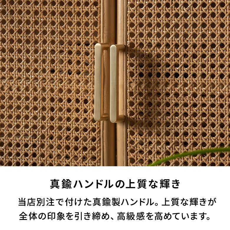 やわらかなアーチトップのフォルムと、軽やかなラタンメッシュ扉が、空間におしゃれで上品な印象をプラス。さらに真鍮ハンドルを組み合わせることで、ナチュラルな素材感の中に洗練されたアクセントを加えています。