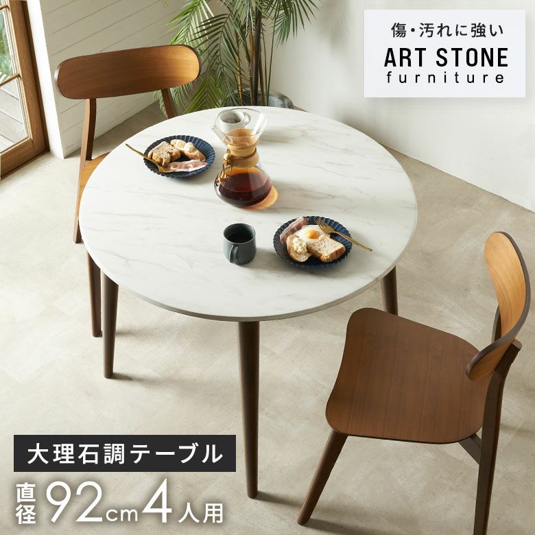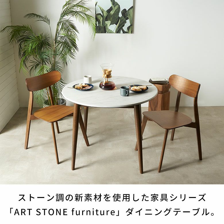 天然石のような高級感のある見た目と、扱いやすい高機能性が人気のハイセンスな家具シリーズ「ART STONE furniture」のラウンドダイニングテーブル 傷や汚れに強い新素材を使用した大理石調天板と、無垢材の脚で仕上げたおしゃれなダイニングテーブル ART STONEラウンドテーブル直径92cm(84316)