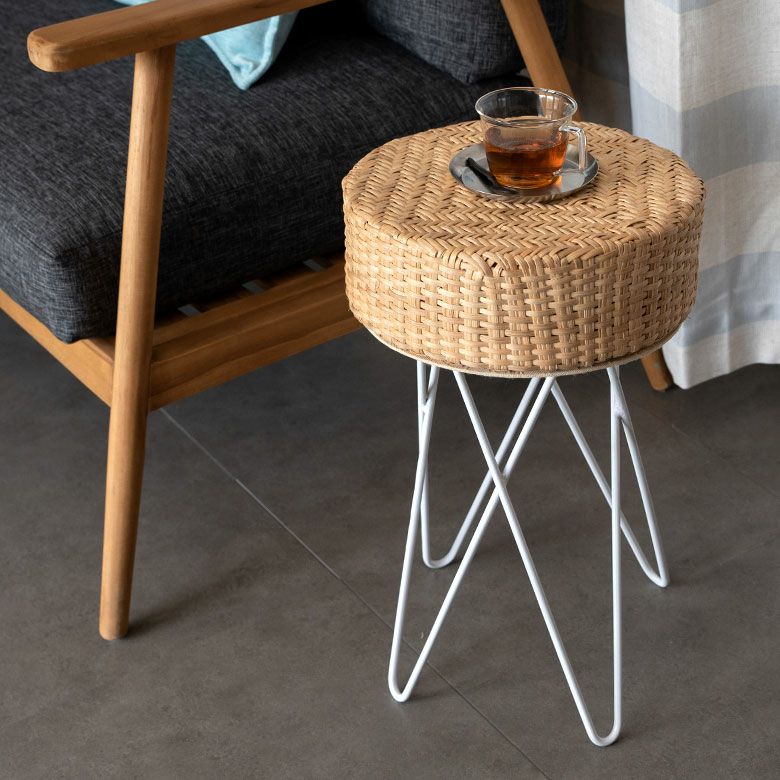 いす ラウンジチェア デザイン家具 リビングチェア おしゃれ スツール ラタン製 ラタンチェアー ラタンチェア アイアン製 クロス脚 丸型座面 座面高52cm ホワイト[13715]【 椅子 一人掛け チェア 籐家具 背もたれ無し リビングチェア 玄関 西海岸 シャビーシック BOHO 北欧 リゾート アジアン家具 カフェ風 ホテル 在宅勤務 】