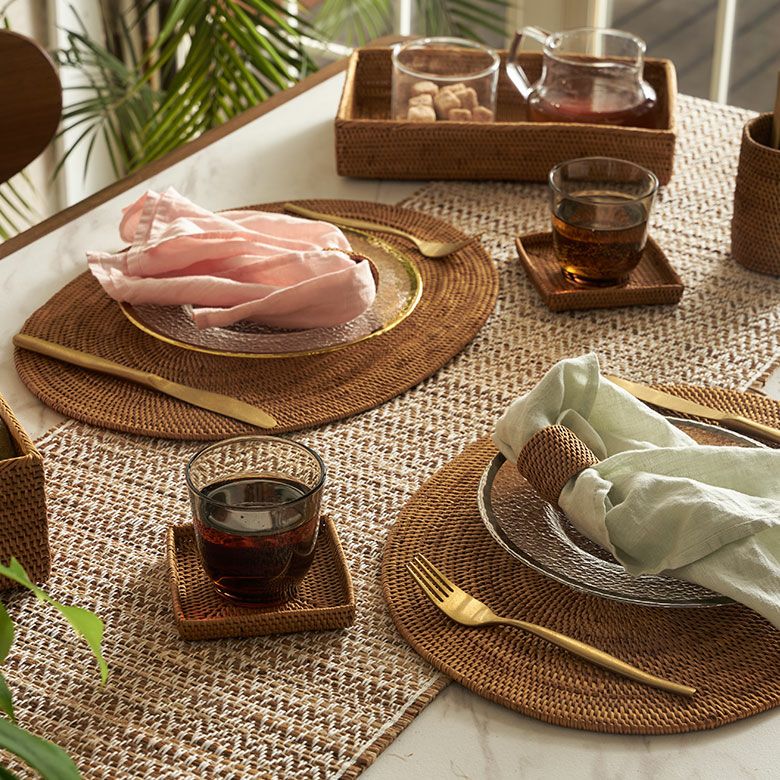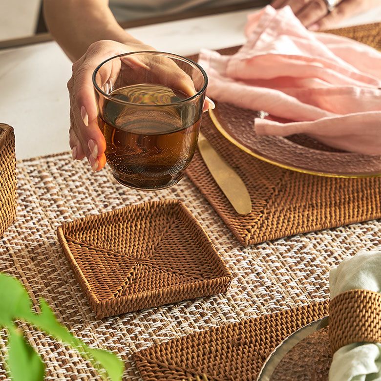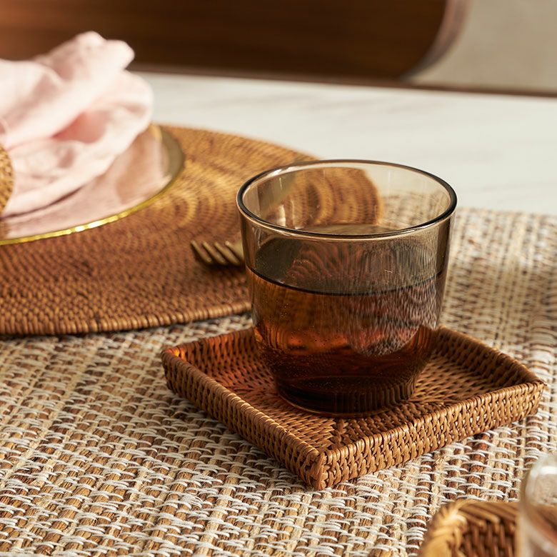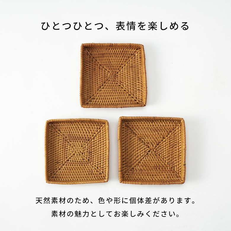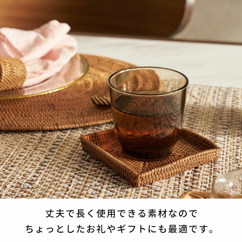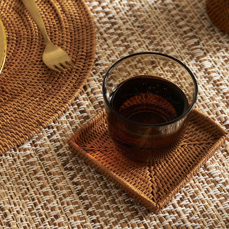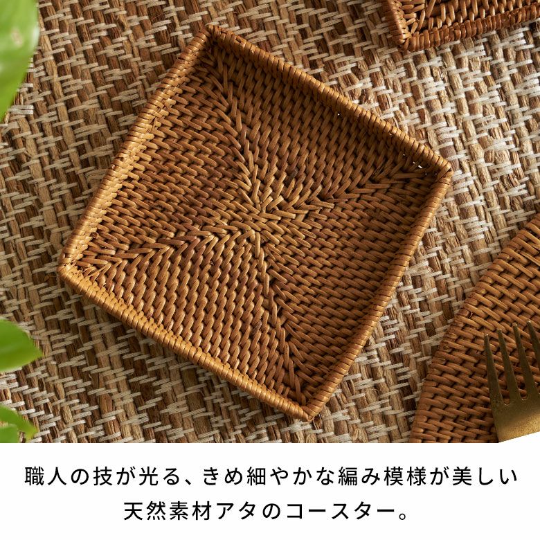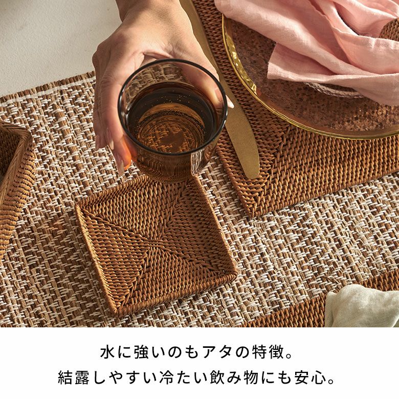 インドネシアで作られたアタのコースター。直線的でスタイリッシュなスクエアはきっちり並ぶので食卓がすっきり見えます。また、フチありでコースター周囲に高さがあるため、存在感が出てテーブルがぐっと華やかに。グラスから垂れた水滴を受け止め、外へ流れにくいのでテーブルを濡らしにくく、グラスやカップが滑りにくいため安定感があります。