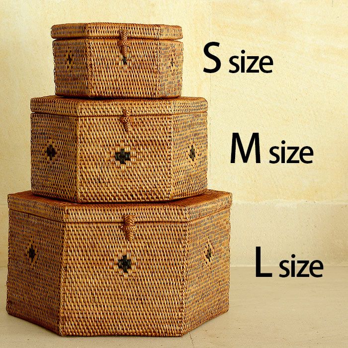 アタで編まれた六角形のフタ付き小物入れケース[M] バリ島トゥガナン村の職人さんがひとつずつ丁寧に編んで作ったアタのフタ付き小物いれバスケット。 |